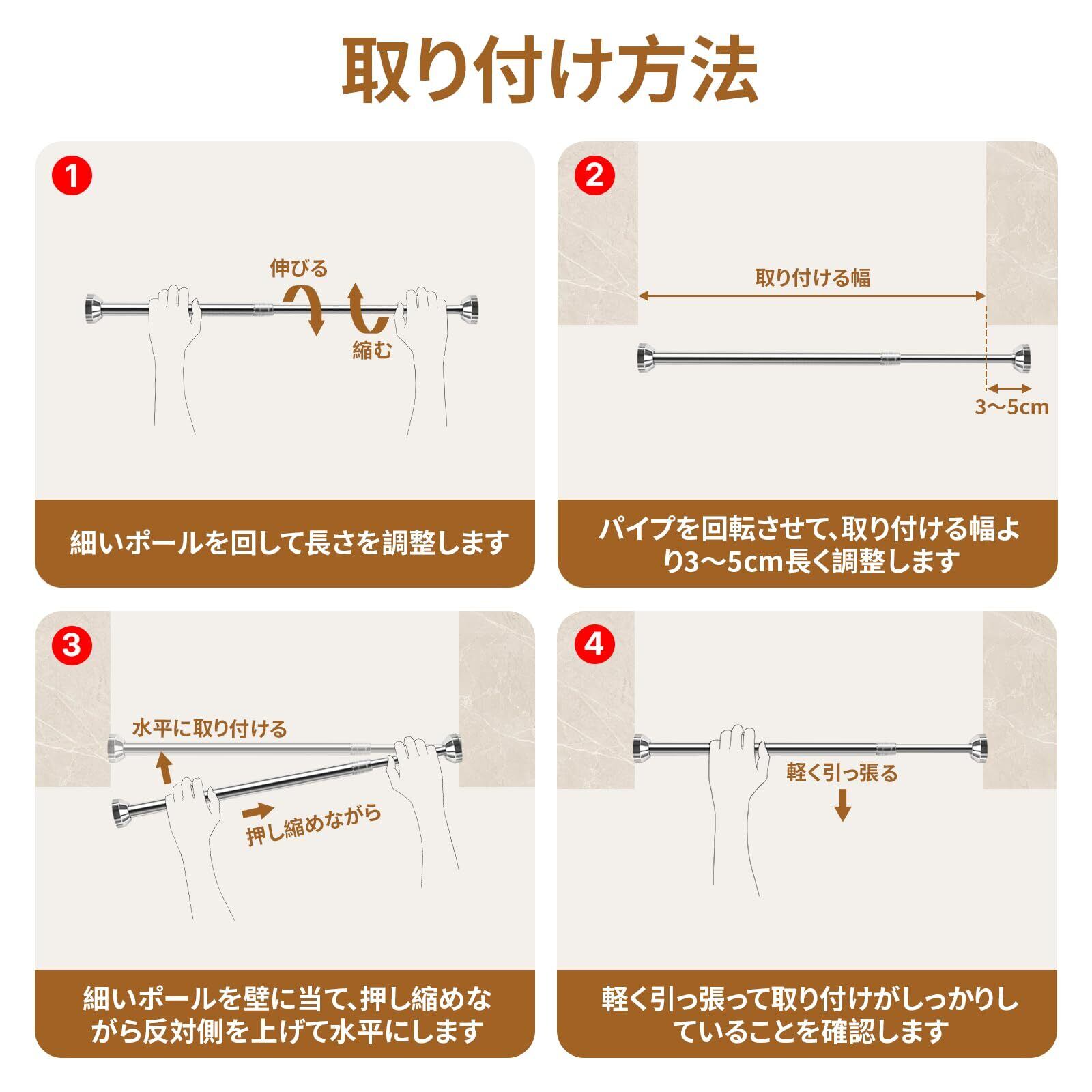 ✨【このつっぱり棒は、工具不要で手軽に取付けが可能です!】賃貸でも安心してお使いいただけるため、壁に穴を開けることなく、さまざまな場所に設置できます。