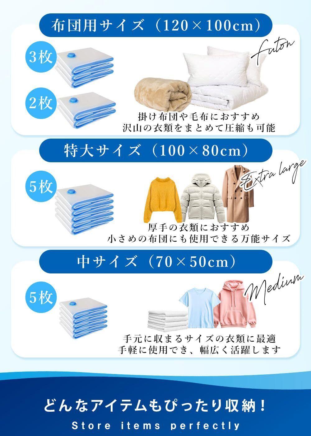 【各サイズ】[布団用 120*100cm ]:羽毛布団や掛け布団から布団一式まで大判のものにオススメ。[特大 100*80cm ]:面積を取るダウンジャケットから枕やバスタオル、ぬいぐるみなどにもオススメ。