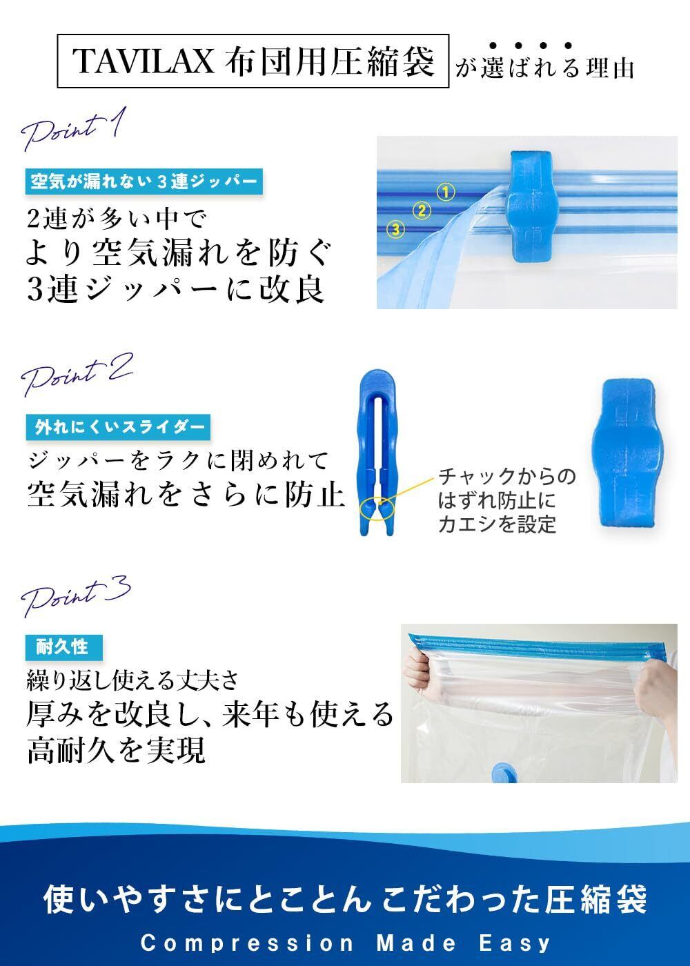 【長期間でも空気漏が漏れない】圧縮袋を使用した人の悩みで圧倒的に多いお声は、時間が経つと空気が混入してしまうこと。その悩みを解決する為に、TAVILAX独自で3連ジッパー仕様にしました。今までとは違う長期保管に優れた圧縮袋です。