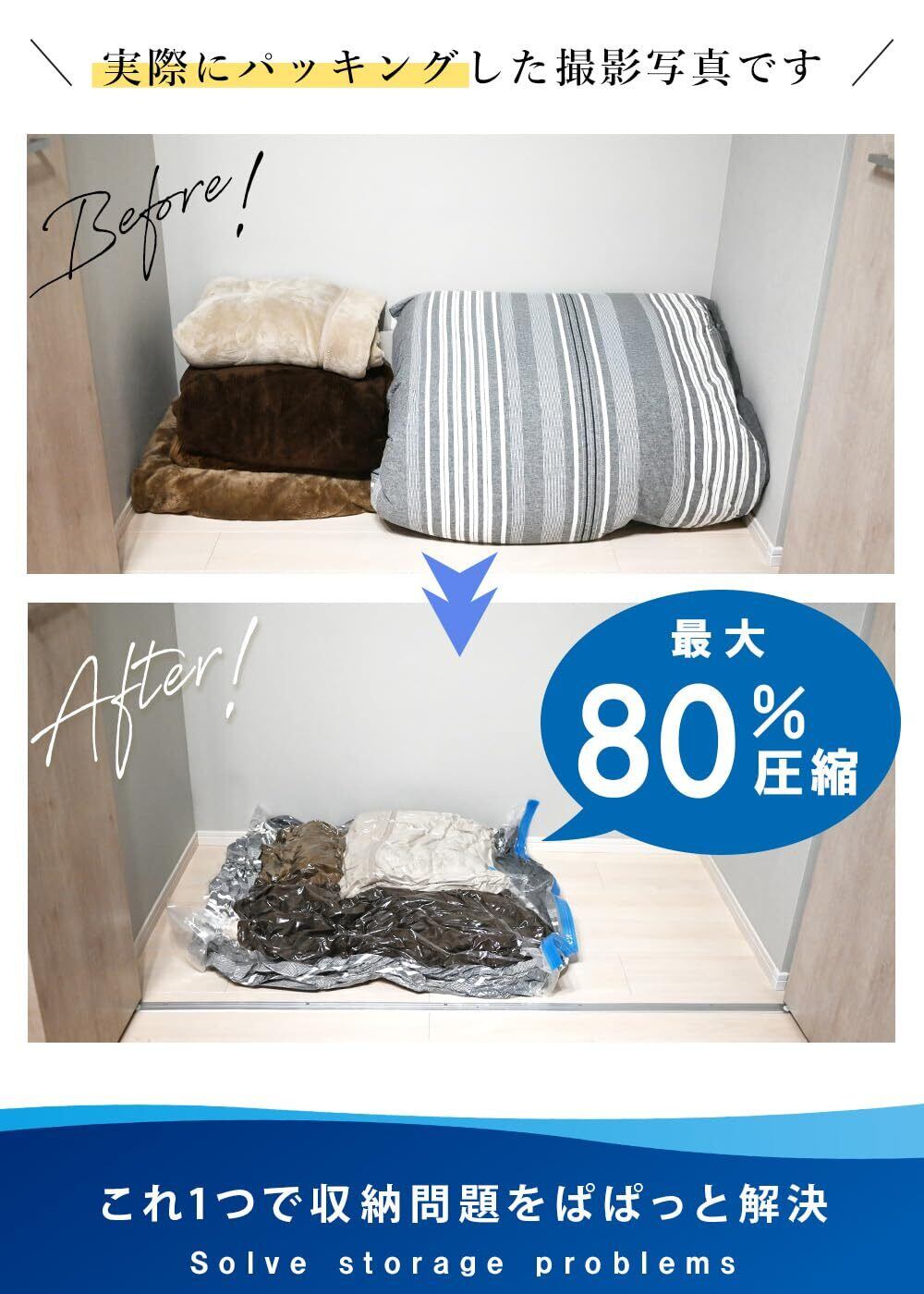 ✨【掃除機を使って手軽に圧縮できるため、隙間なく収納が可能です!】大きめのサイズなら、冬用掛け布団を2~3枚まとめて収納でき、スペースを最大限に活用できます。