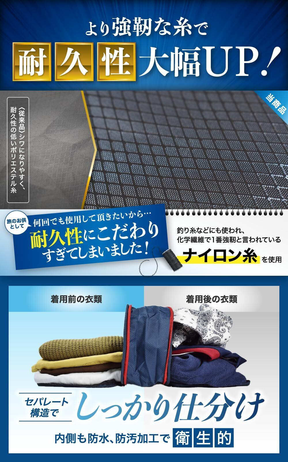 【中身が見えないナイロン素材】 ナイロン素材だからビニール製の圧縮バッグのように中身が見える心配がありません。ふいにキャリーケースを開ける場面でも安心です。
