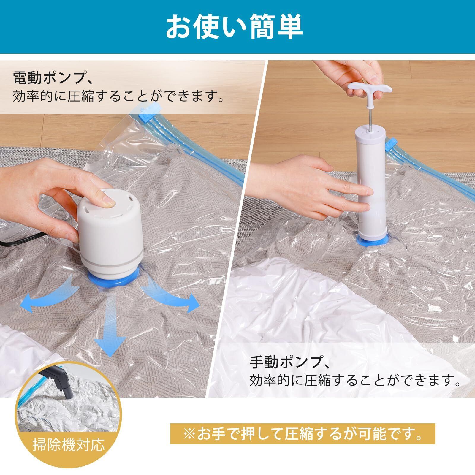 お使い方:➀収納品(衣類/ふとん)を圧縮袋に入れます。➁スライダーでチャックを閉じます。➂ポンプで吸引(掃除機/電動バルブ可)。➃バルブキャップを締めて完了です。ご注意:保存期間は約6ヵ月です。6ヵ月を過ぎても圧縮状態に異常がなければ、そのまま保存できます。但しその場合は回復率が多少悪くなります。収納物のためには、6ヵ月に1度圧縮袋から出し天日干しをして再度圧縮し直してください。