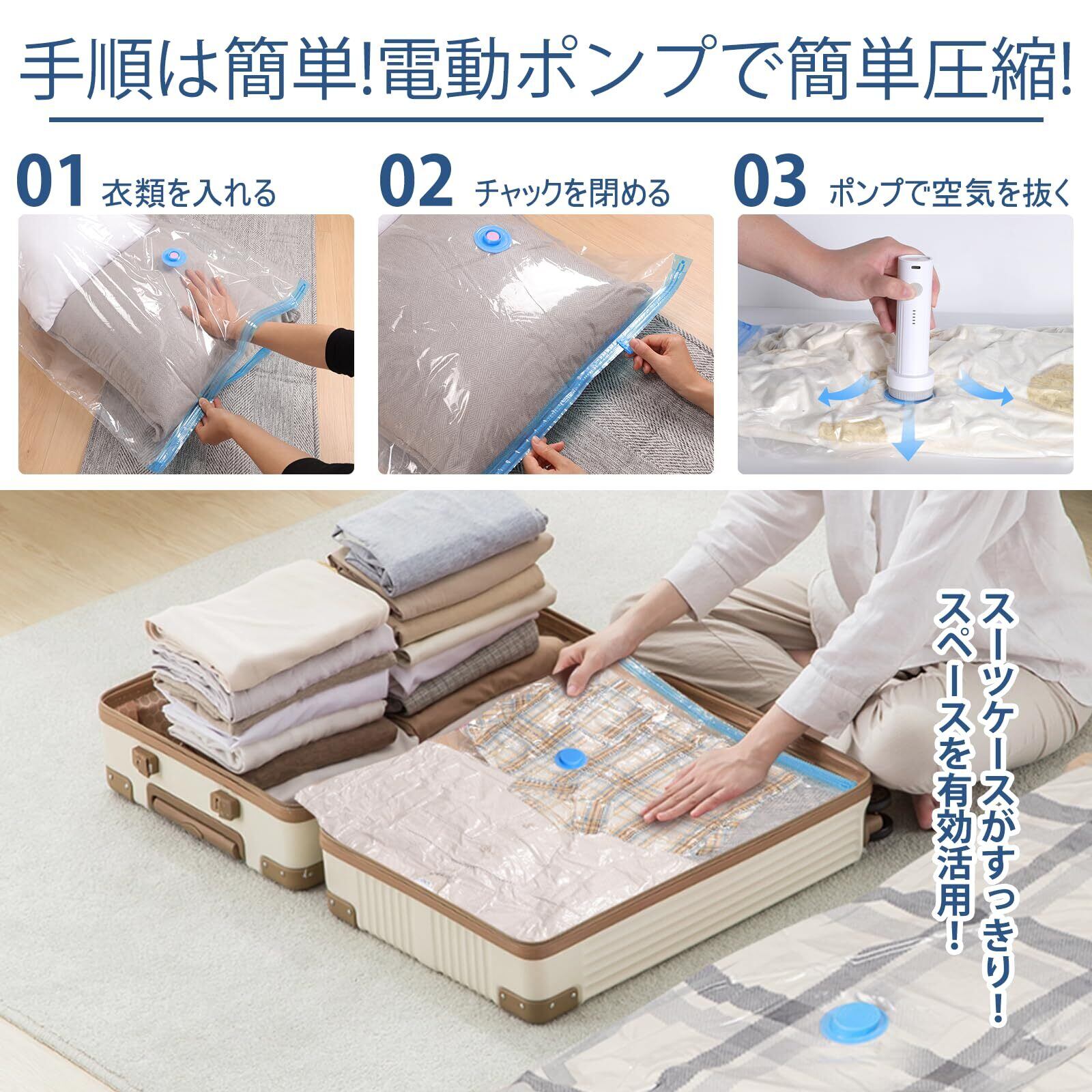 【高効率で強力な吸引力】:最新式電動ポンプを搭載し、わずか数秒で素早く効率的に空気を排出。季節の変わり目に必要ない布団や衣類をまとめてコンパクトに圧縮収納できるため、収納スペースを劇的に削減。限られた空間を最大限に活用したい方へぴったりのアイテムです。