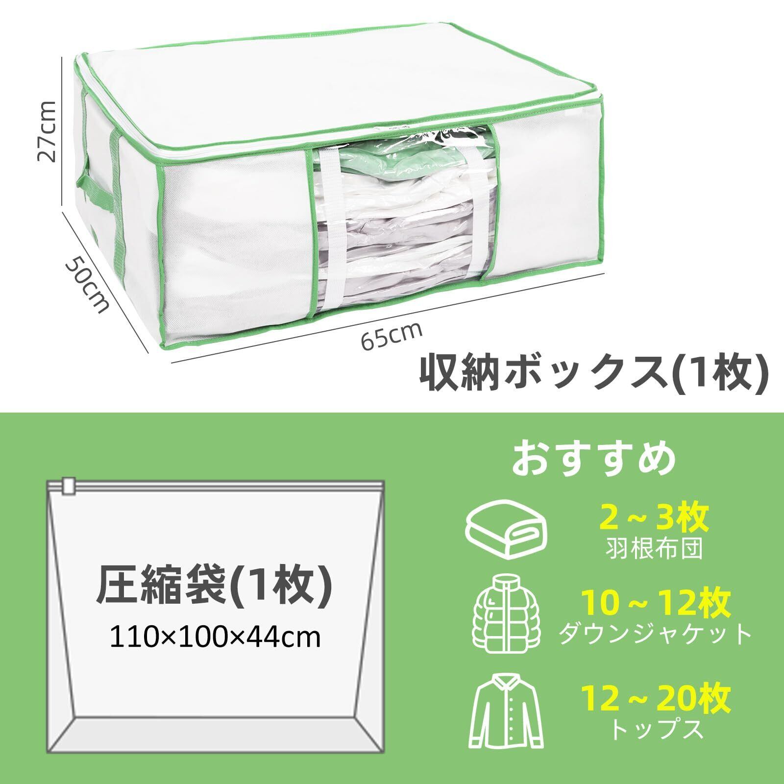 大容量:収納ボックス(1枚):65 x 50 x 27 cm 圧縮袋(1枚):110 x 100 x 44 cm。収納目安:掛け布団を3枚くらい、衣類を12枚くらい、ぬいぐるみを12個くらい収納できます。圧縮袋と収納ケースが一体に,容量を減らすだけでなく、クローゼットの中に美しく収納することができます