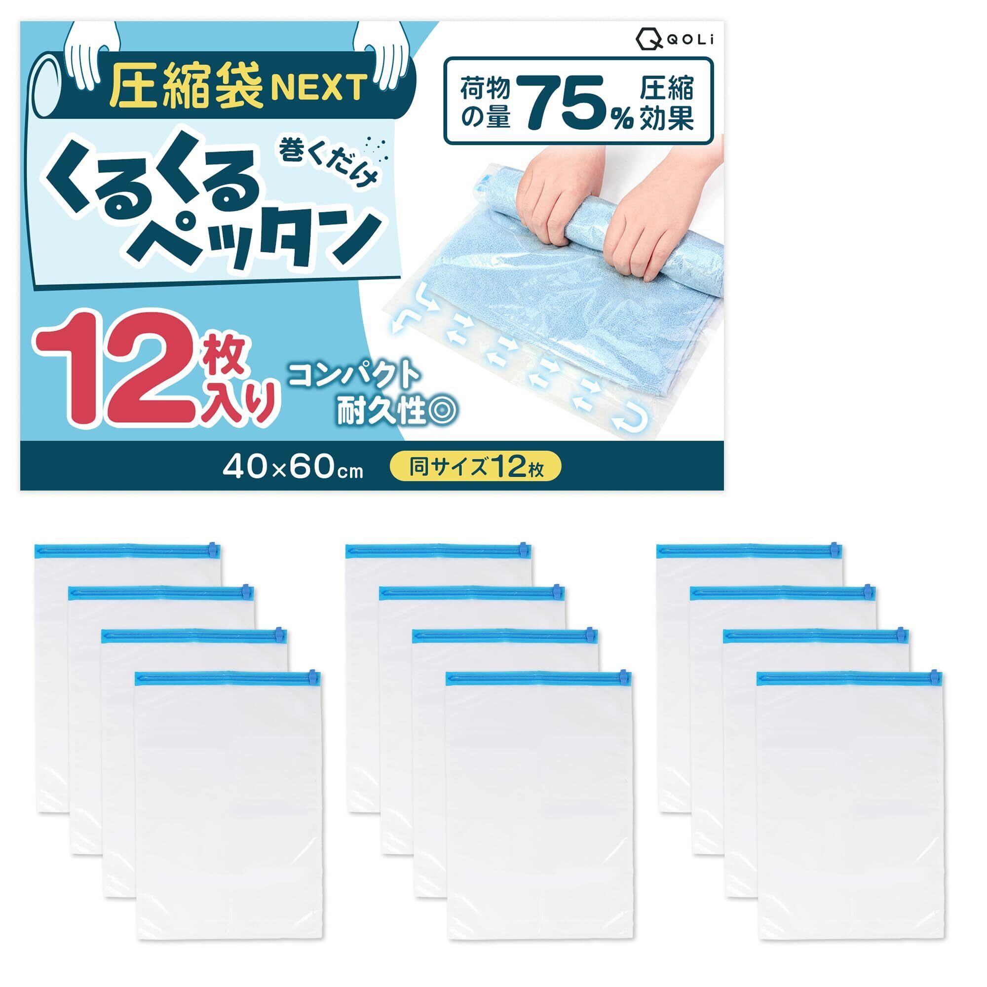【荷物の量75%圧縮】 手で巻くだけ 圧縮袋 耐久性 二重ジップ 漏れにくい 旅行 出張 収納 省スペース 【くるくるペッタン】 (40x60cm(同サイズ12枚入り))