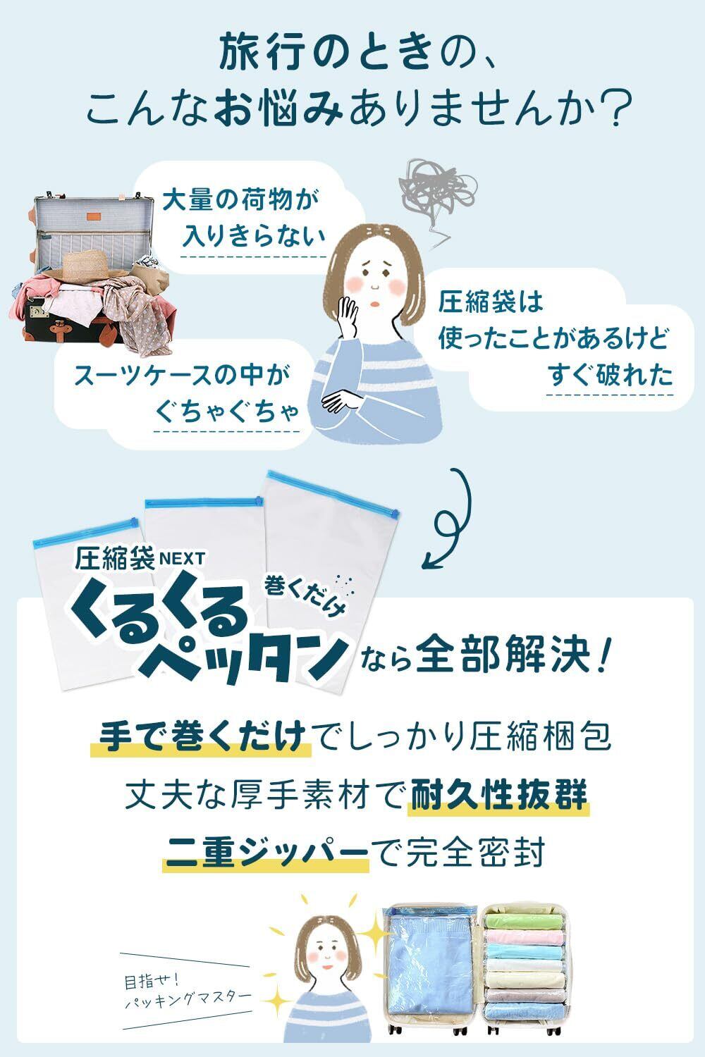 ✨【「くるくるペッタン」は、簡単に荷物を圧縮できる便利なアイテムです!】手で巻くだけで、衣類や寝具を75%圧縮し、貴重なスペースを有効活用できます。旅行や出張、日常の収納に役立つこと間違いなしです!