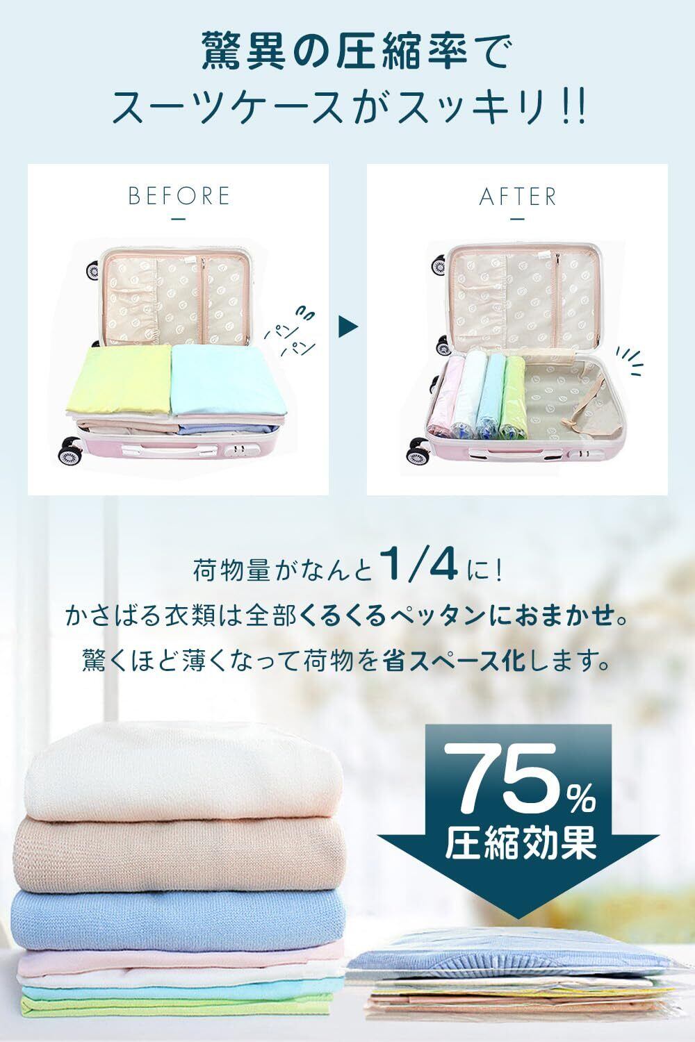 【④省スペース】最大で荷物の量を75%減らし、スーツケースやリュックの中がスッキリします。