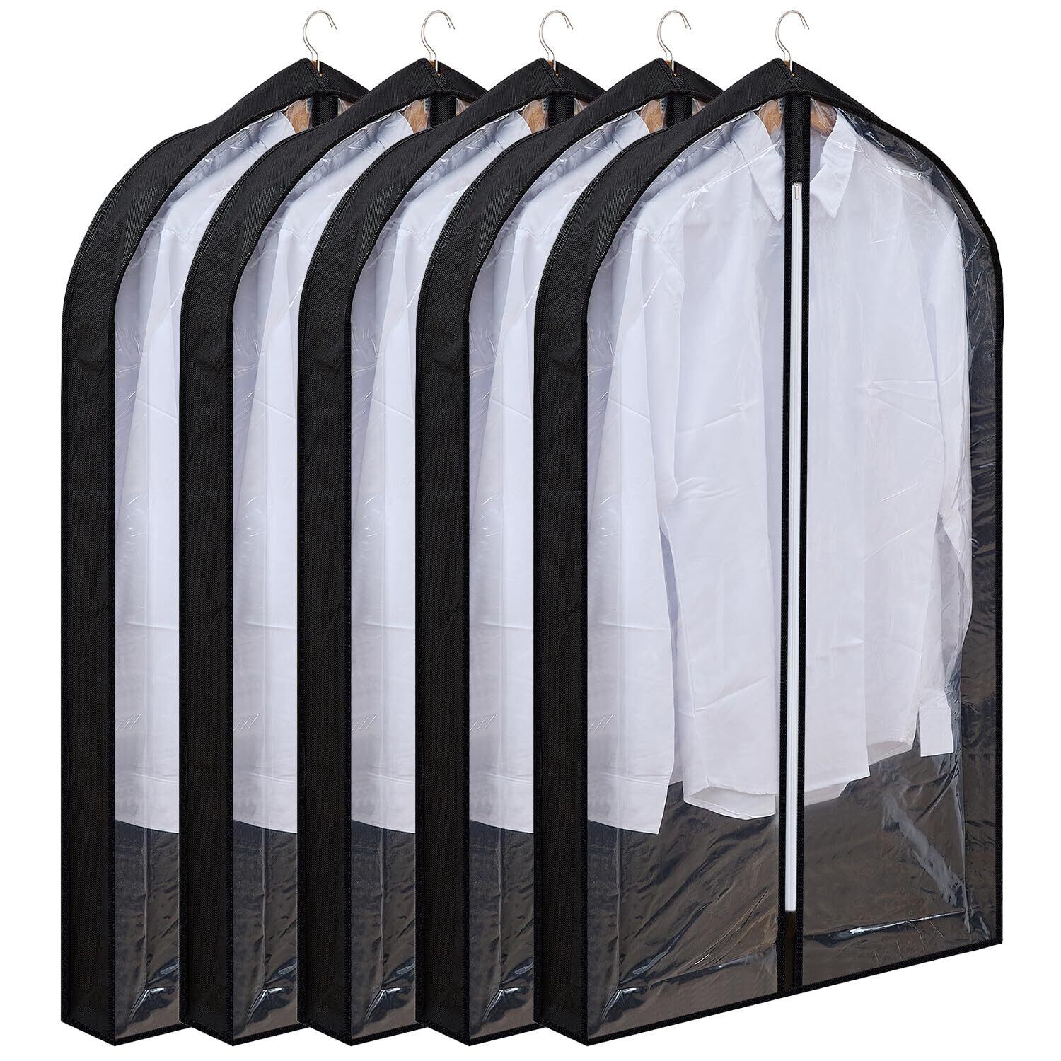 VECELO 衣類カバー 防塵カバー スーツカバー ハンガー 5枚組 マチ付き 湿気取り 防汚 吊り下げたまま使えるゆったりシワになりにくいマチ付き洋服カバー 通気性の良い不織布 透明窓 センターファスナー 衣装カバー 100CM