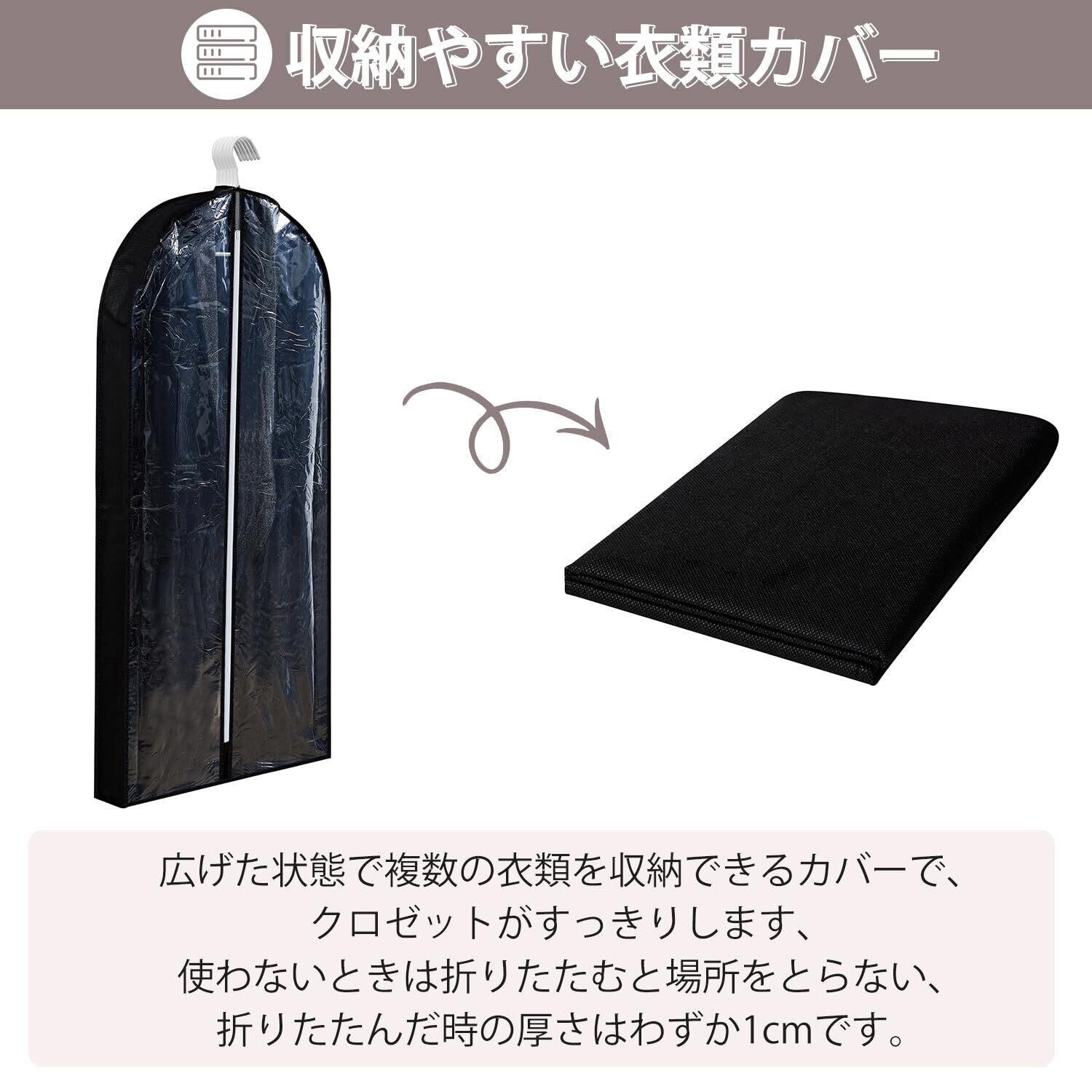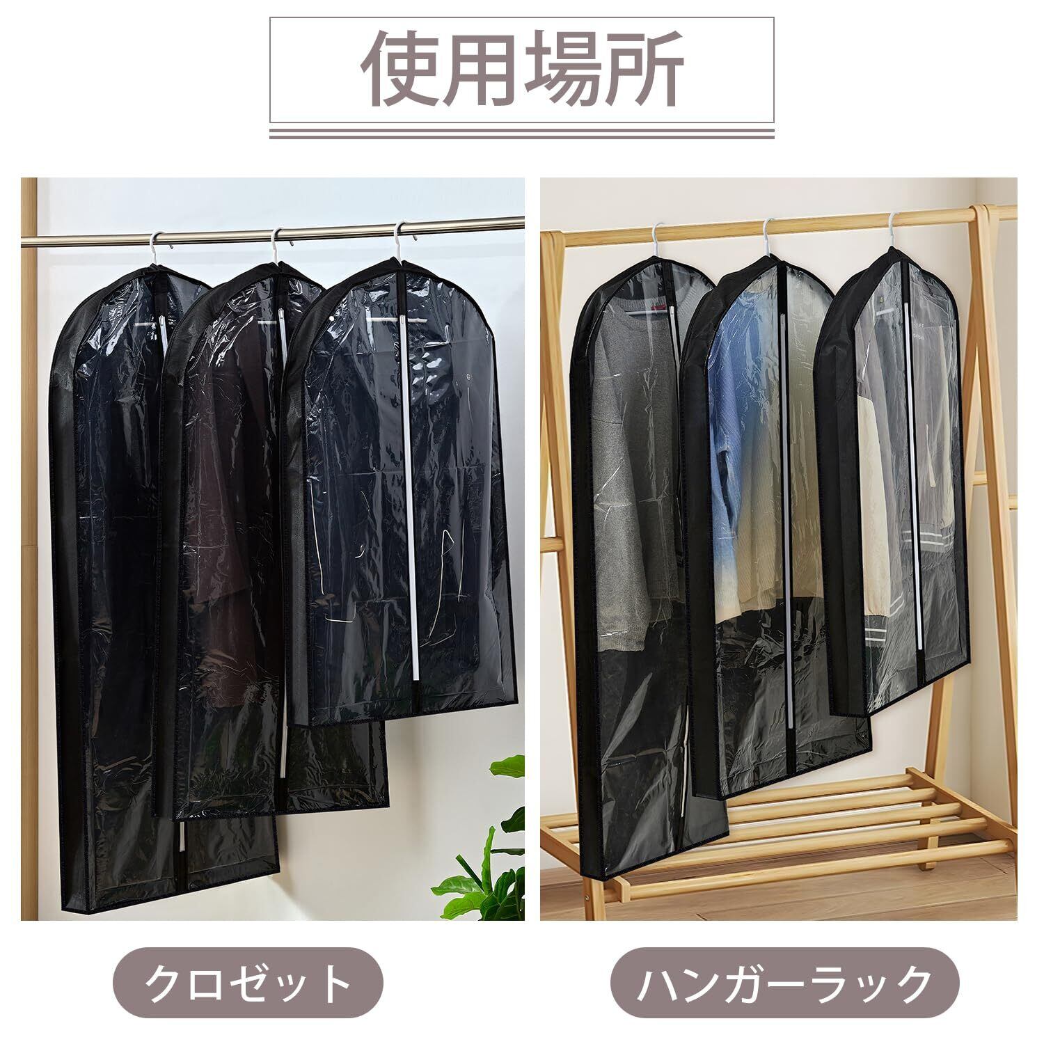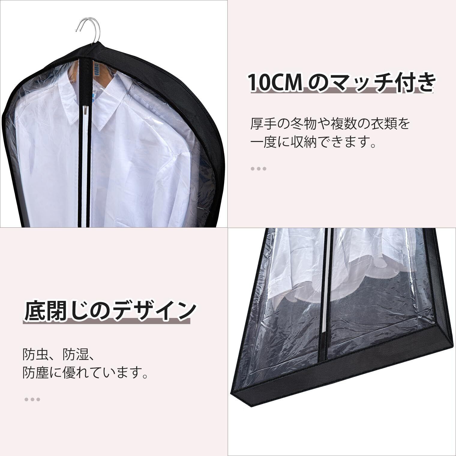 【可視窓付き】前面は完全に透明で、防塵カバーを開けずに探したい衣類を確認できます。【マチ付きシワになりにくい】マチを設けた立体的なデザインで、衣類を入れても圧迫されずシワになりにくいです。