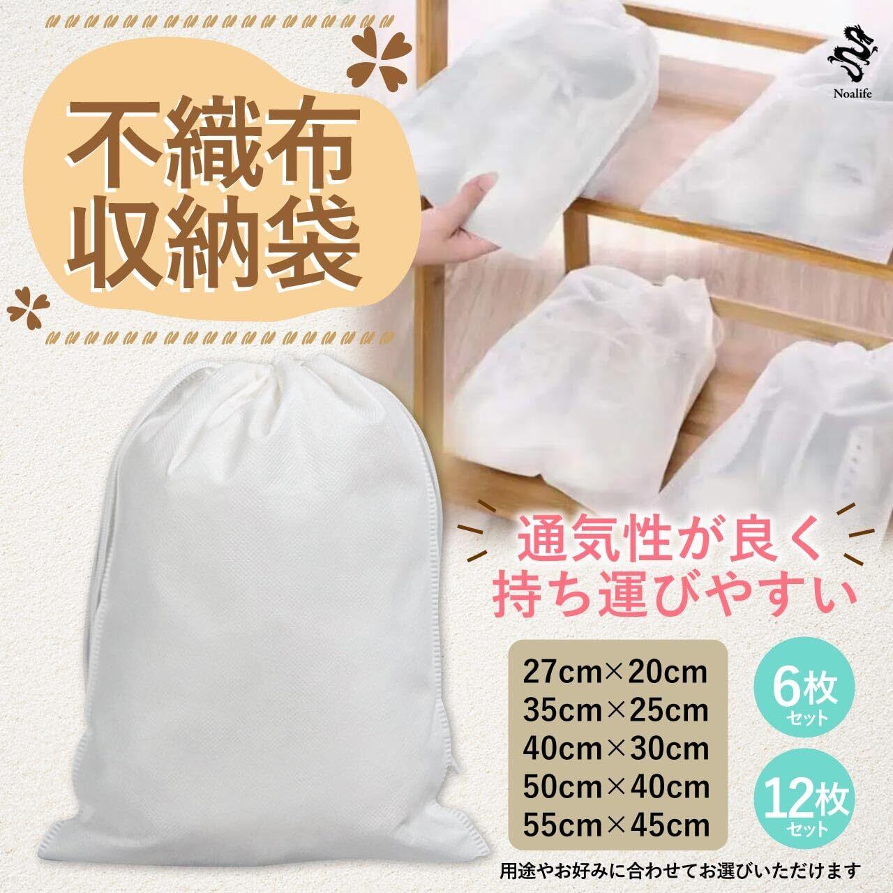 「Noalife 不織布収納袋」は、シンプルさと機能性を兼ね備えた高品質なアイテムです。日常の収納ニーズに耳を傾け、あなたの生活空間を快適に整理整頓します。