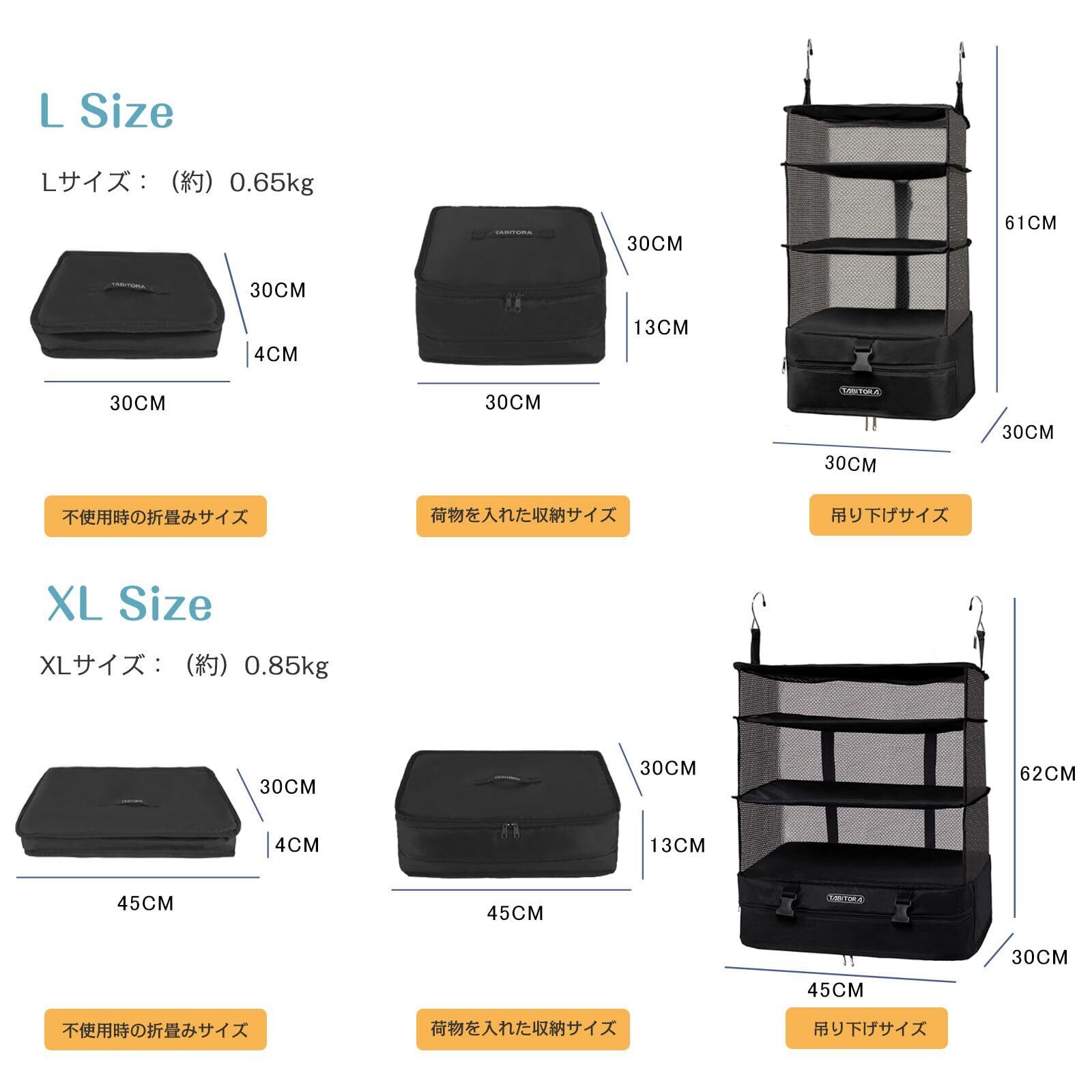 【素材】ポリエステル 【カラー】ブラック ブルー グレー ローズ カチオングレー 【吊り下げサイズ】Lサイズ:30*30*61CM XLサイズ:45*30*62CM 【荷物を入れた収納サイズ】Lサイズ:30*30*13CM XLサイズ:45*30*13CM 【不使用時の折畳みサイズ】Lサイズ:30*30*4CM XLサイズ:45*30*4CM
