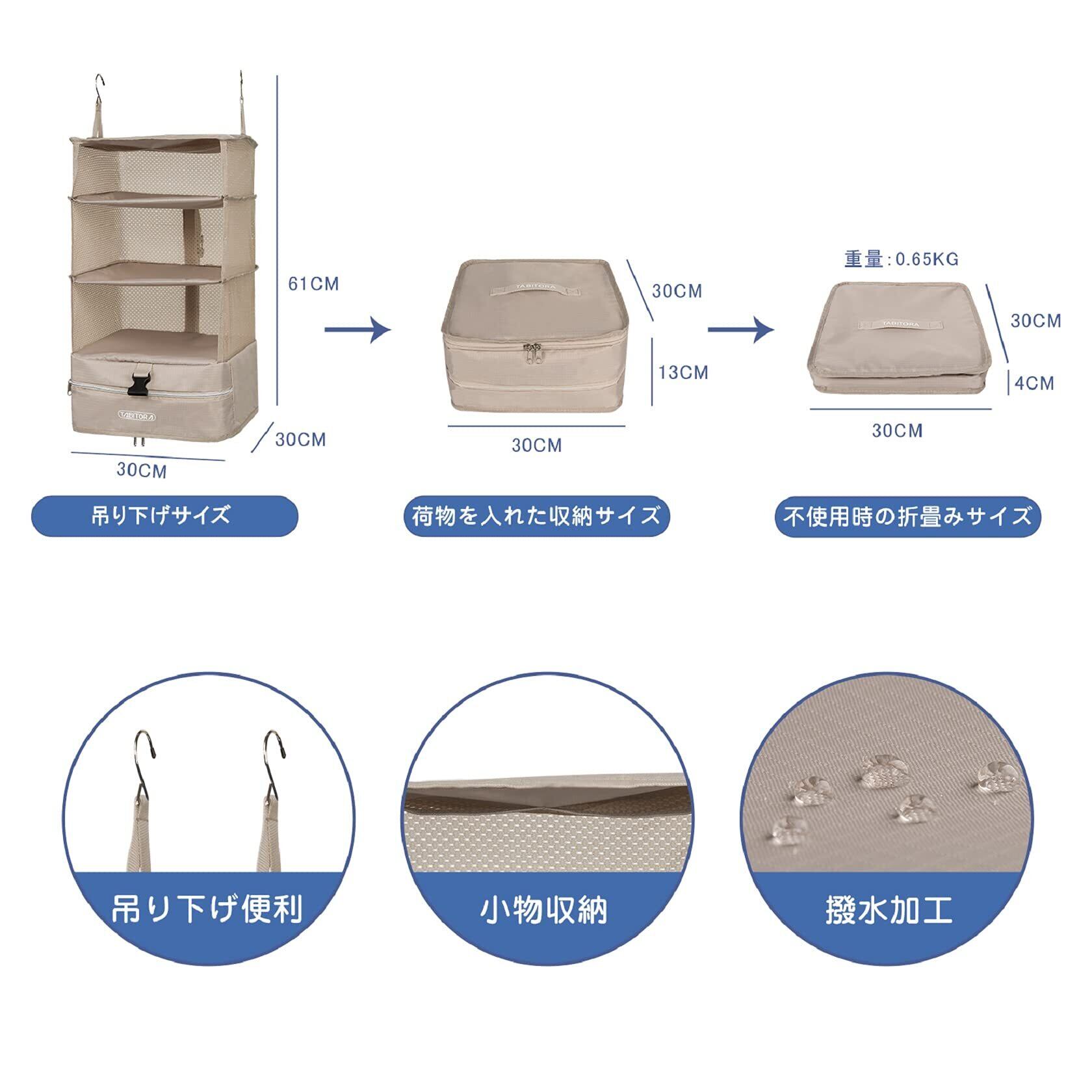 \【◆TABITORA 収納ボックス 吊り下げ インナーバッグ L ベージュ】旅行や出張に最適な省スペース収納!/