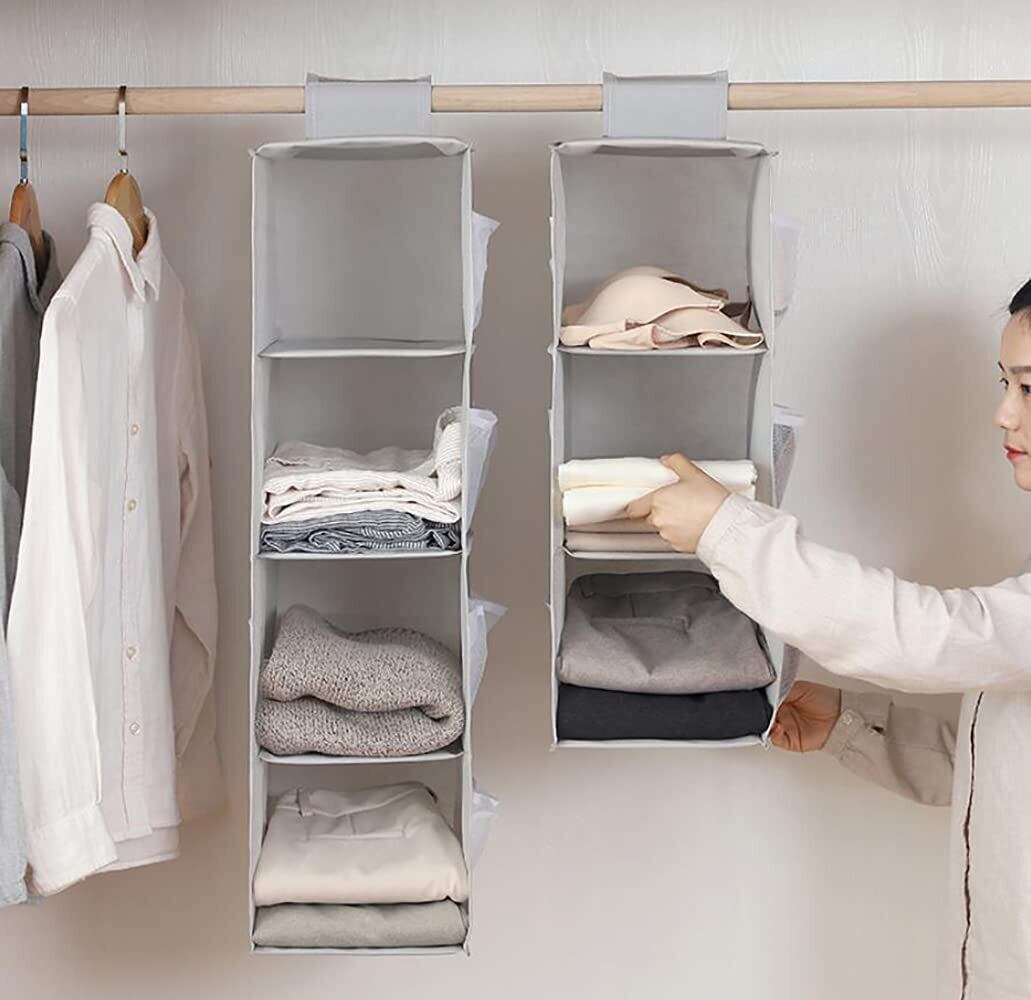 ✨【「吊り下げ収納」は、衣類や小物を効率的に収納するための優れた収納アイテムです!】その4段式のデザインにより、下着や靴下、帽子などをすっきりと整理整頓できます。限られたクローゼットの空間を最大限に活用します!