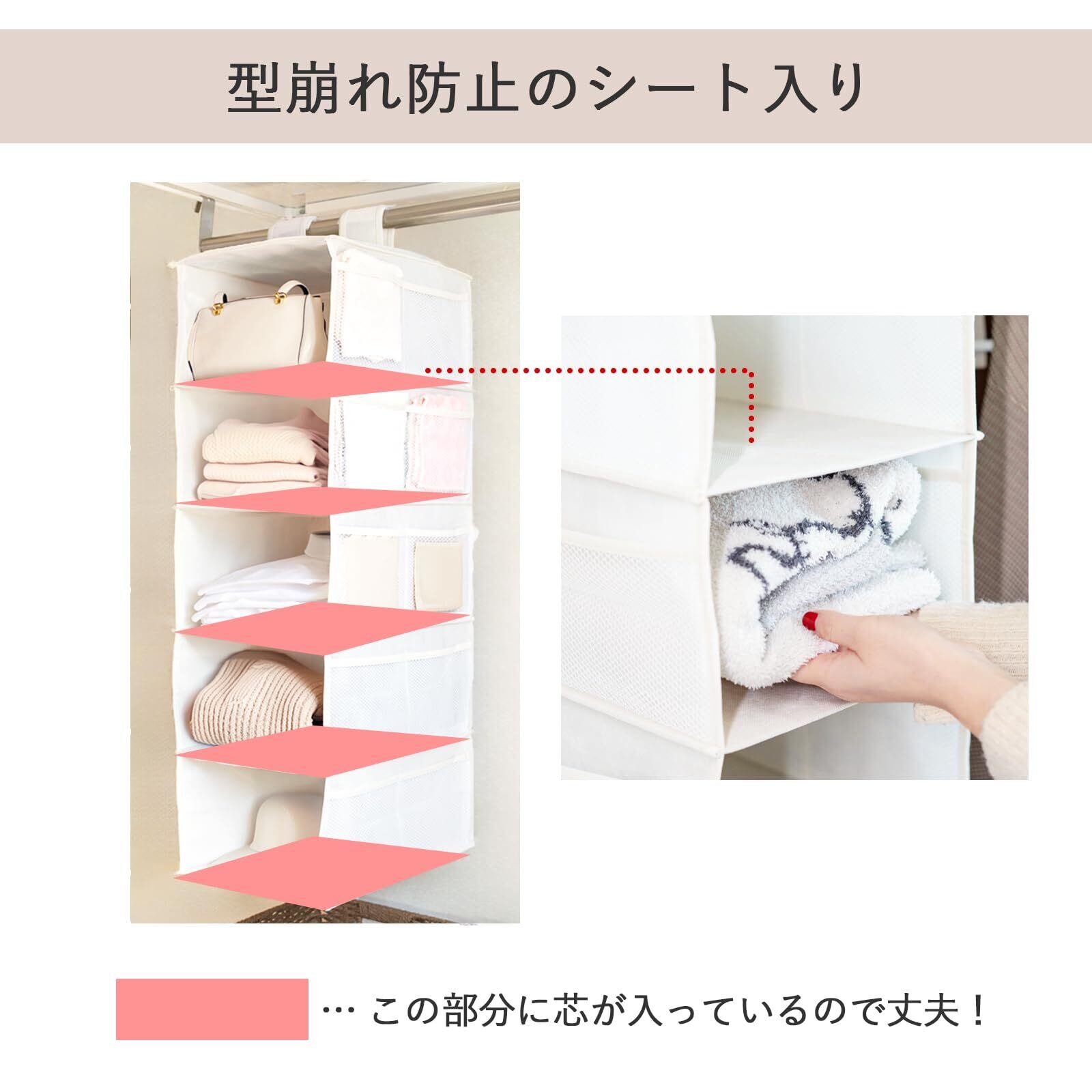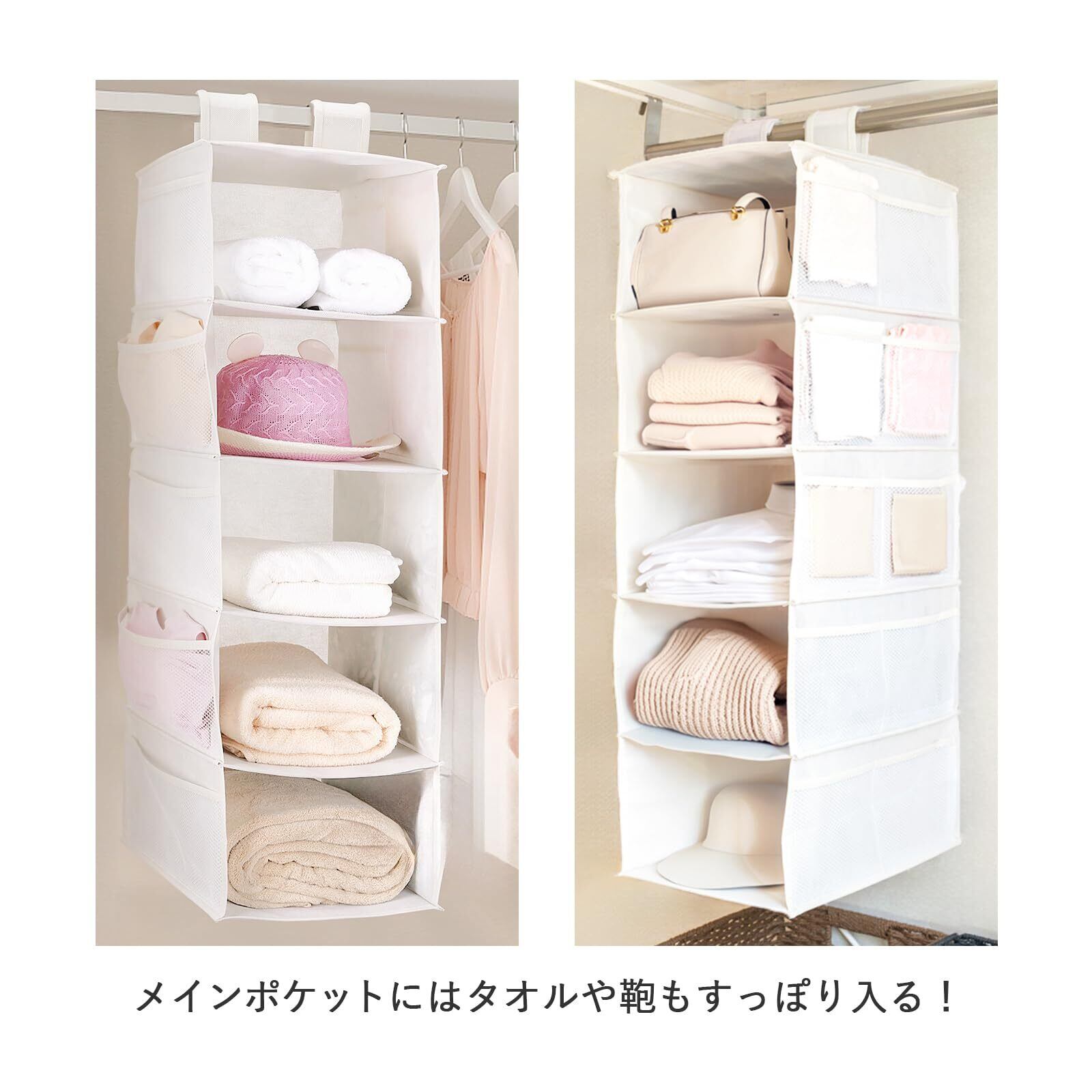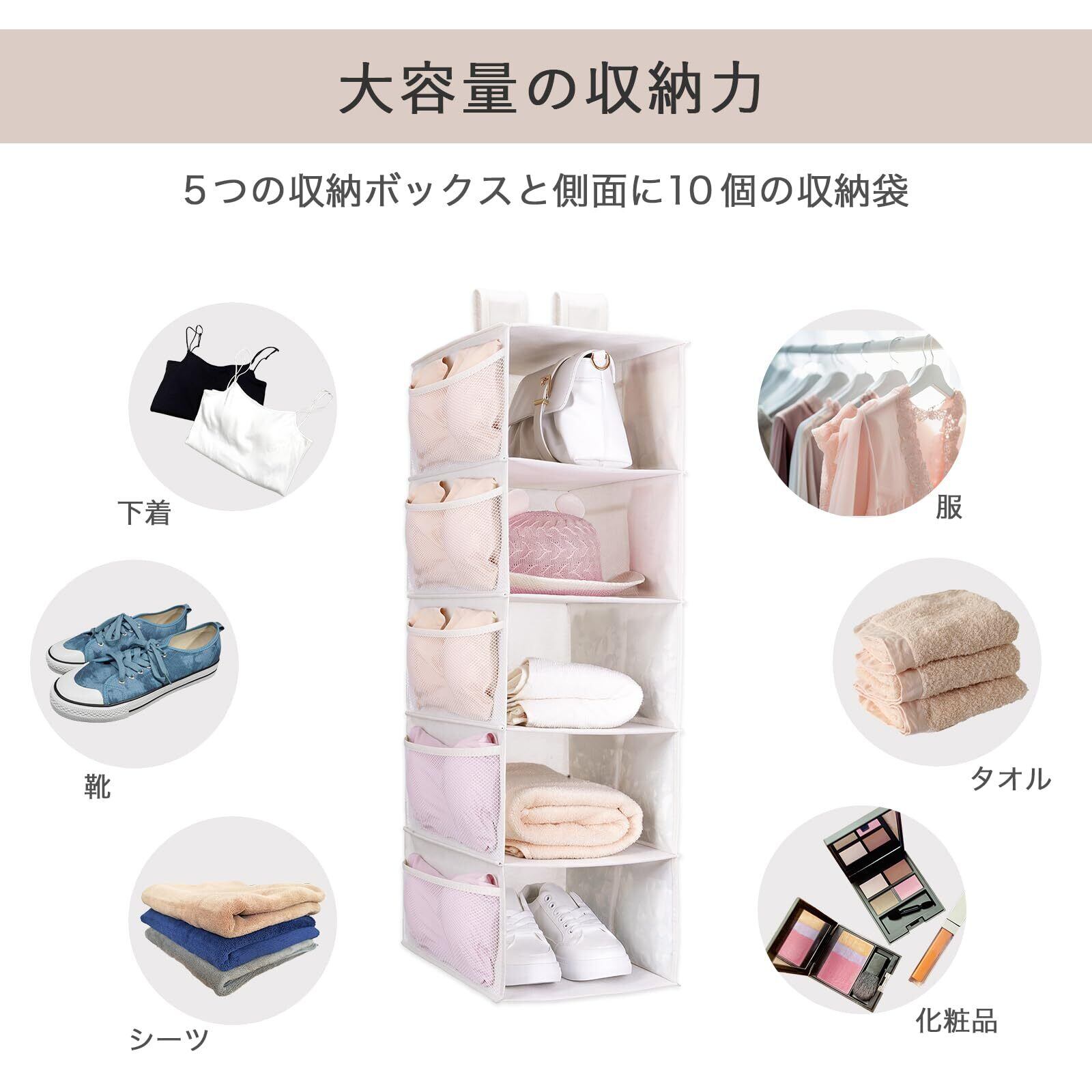 ✨【5段の構造により、衣類や下着、アクセサリーなど多様なアイテムを効率よく収納可能!】特に、ポケットが付いているため、小物も整理しやすく、散らかりがちなクローゼットをスッキリ整えられます。