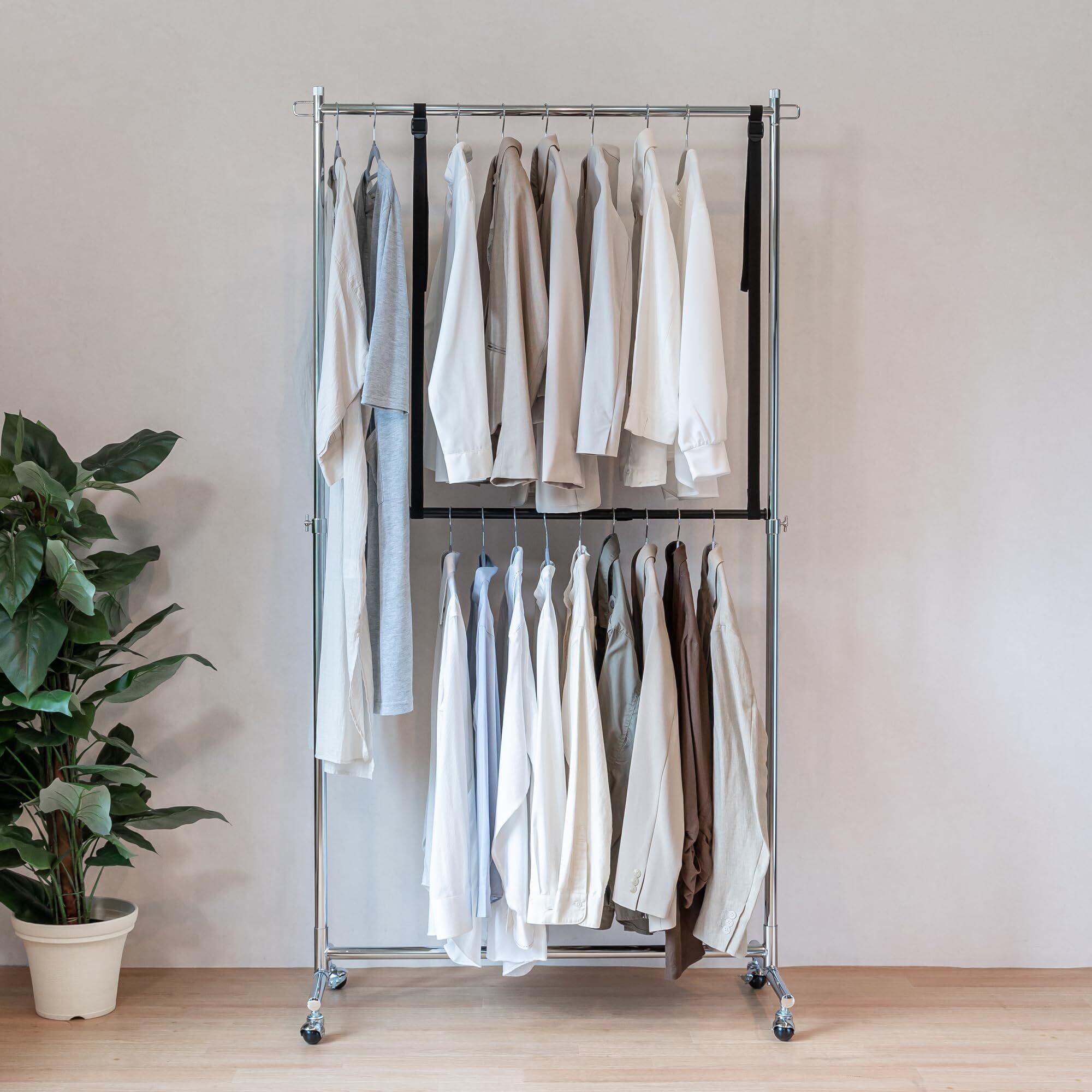 クロ-ゼットなどのバ-に吊り下げるだけで上下2段に収納量アップ!ポールは46〜80cm伸縮可能。高さも衣類に合わせて調整して使えます。下段は背の低いお子様の衣類収納に便利です。耐荷重10㎏迄。バ-から高さ100cm迄使用可能。(材質)ポール:樹脂コ-ティングスチ-ルパイプ、部品:ABS樹脂、ポリアセタ-ル樹脂、吊り下げベルト・固定部品:PP樹脂。