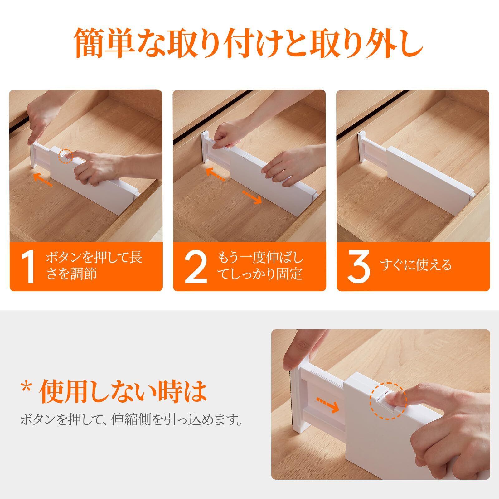 取り付けと取り外しがカンタン: 上部のボタンを押して長さを調節し、もう一度伸ばしてしっかりと固定してからロックします。バネの強力な張力により、ドロワーオーガナイザーはしっかりと直立します。収納するには、上部のボタンを押し、伸ばした側を押します。