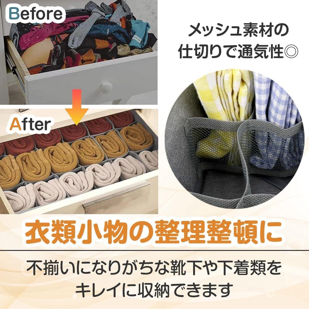 衣類収納オーガナイザー 引き出し仕切り 24マス 下着 靴下 ネクタイ 折り畳み (グレー)