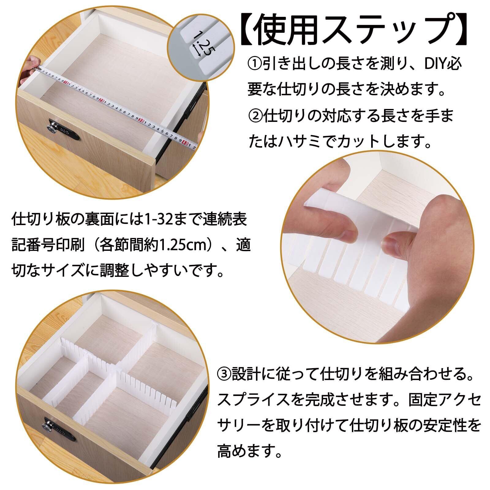 【シンプルで便利な構造】クリーンで明るい白、厚さ2.5mmの耐久性素材採用、引き出し仕切りとしてすっきりしています。裏面には1-32まで連続表記番号印刷(各節間約1.25cm)、適切なサイズに調整しやすいです。ハサミ不要で手で簡単に折り曲げてカットできます。