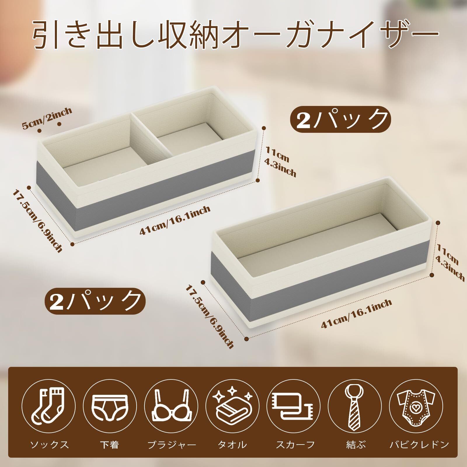 【多機能】靴下収納ボックスには、コンパートメントが 1 つ付いたワードローブ収納ボックス 2 つ (41 * 17.5 * 11cm) と、コンパートメントのない収納引き出し 2 つ (41 * 17.5 * 11cm) の 2 つのサイズがあります、お客様のさまざまなニーズにお応えできるよう、さまざまなサイズと組み合わせをご用意しております