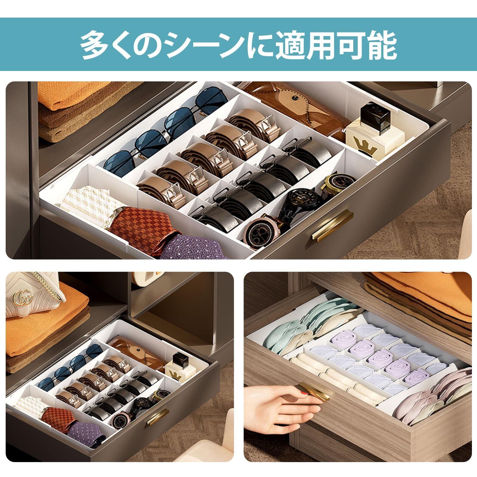 ✨【サイズ調整が可能なこの収納ケースは、31~57 x 23~38 x 8 cmの範囲で、靴下や時計、小物などをしっかりと収容できます!】これで必要なアイテムを一挙にまとめて収納できるため、毎日の生活がより快適になります。
