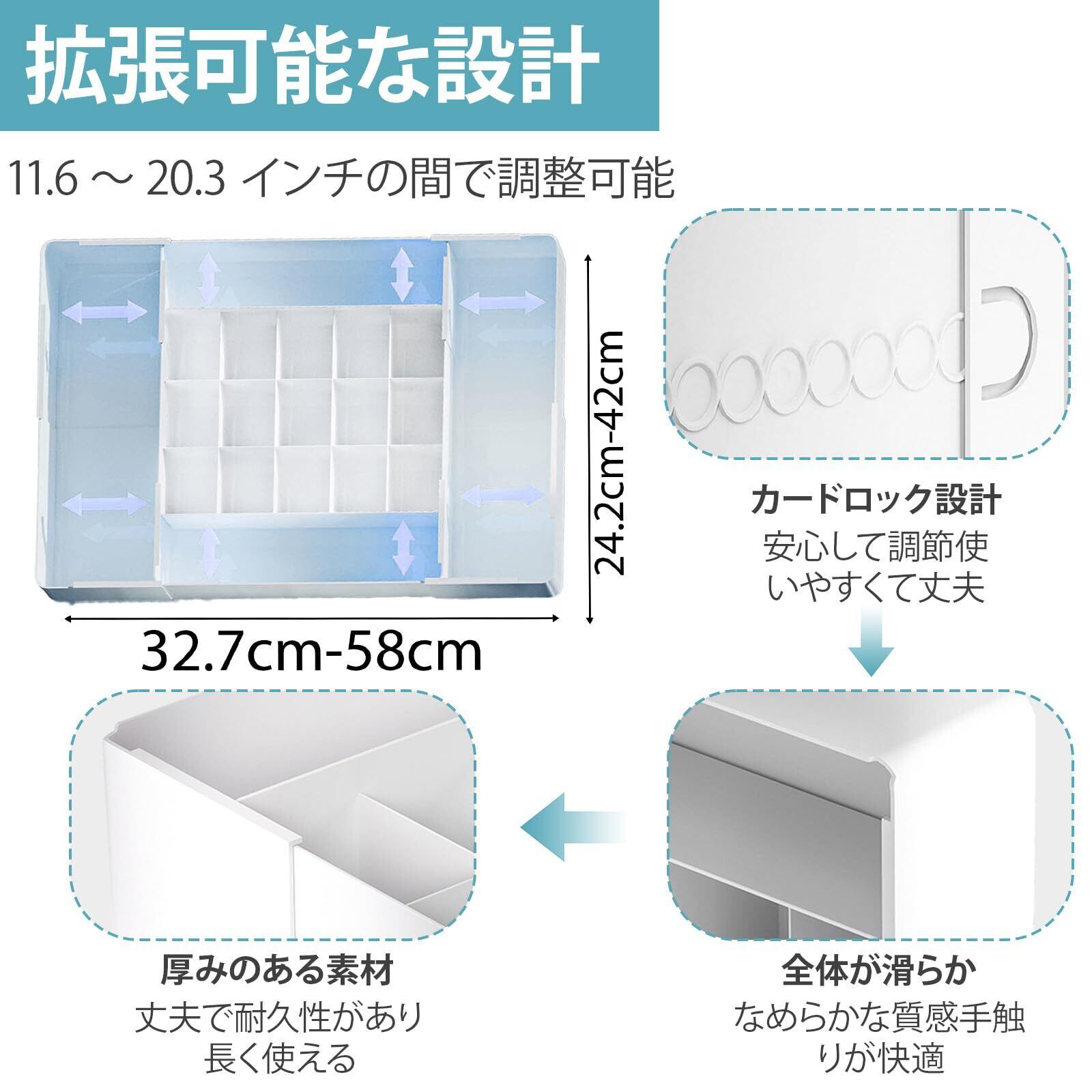 【4方向に伸縮】ぴったりフィットで収納効率UP。引き出しのサイズに合わせて4方向へ自由に伸縮可能。最大約57cmまで広がり、あらゆる収納スペースにぴったりとフィット。無駄な隙間を作らず、限られた空間を最大限に活用できます。