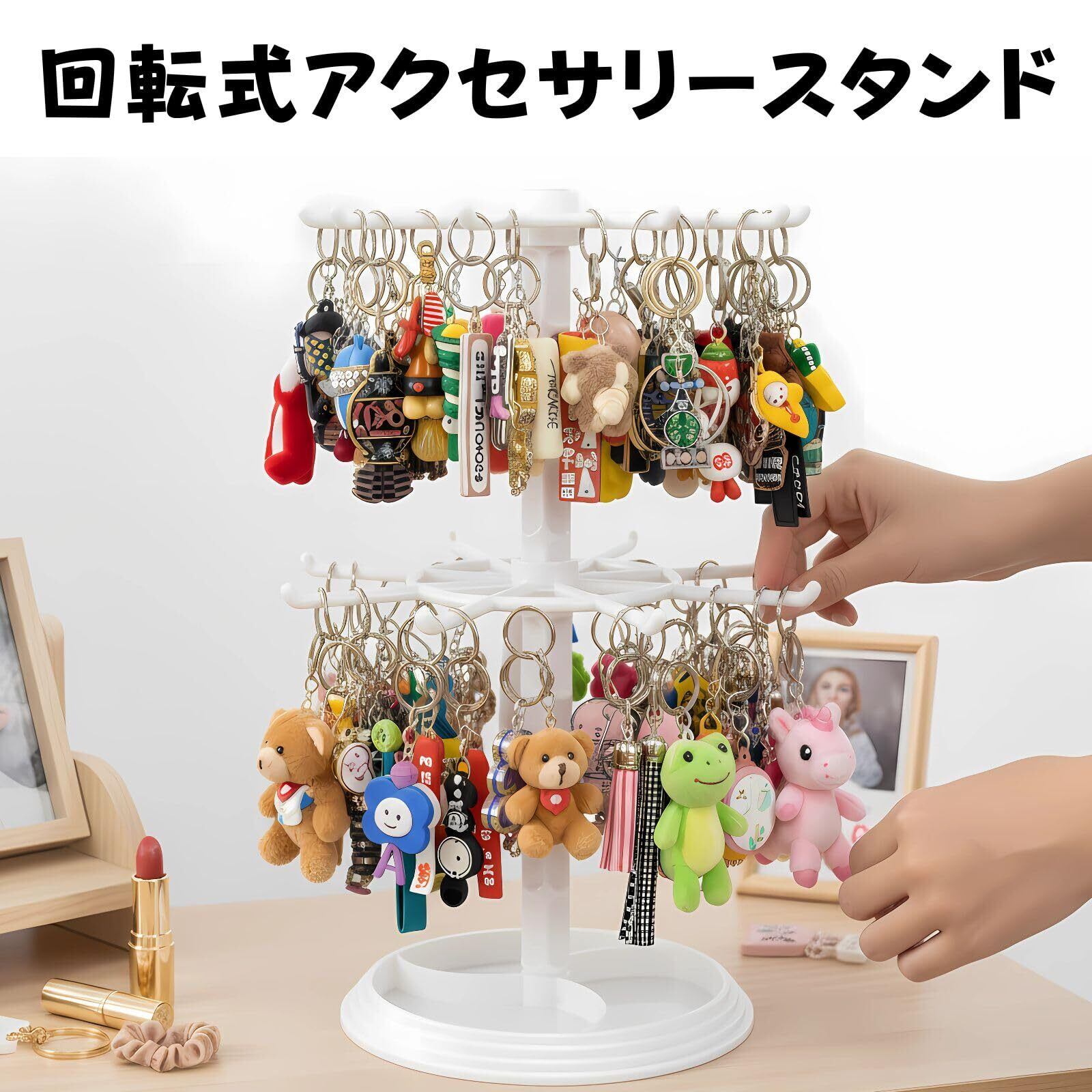 【回転式で取り出しやすい】360度回転する2段のアクセサリースタンド は、推しのキーホルダーやぬいぐるみのほか、ネックレスやブレスレットなどのアクセサリーを収納し、一目で確認できます。