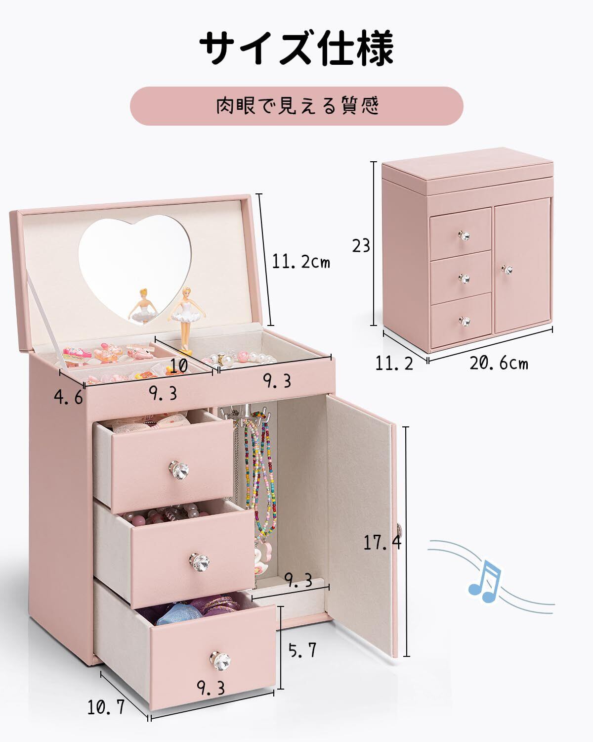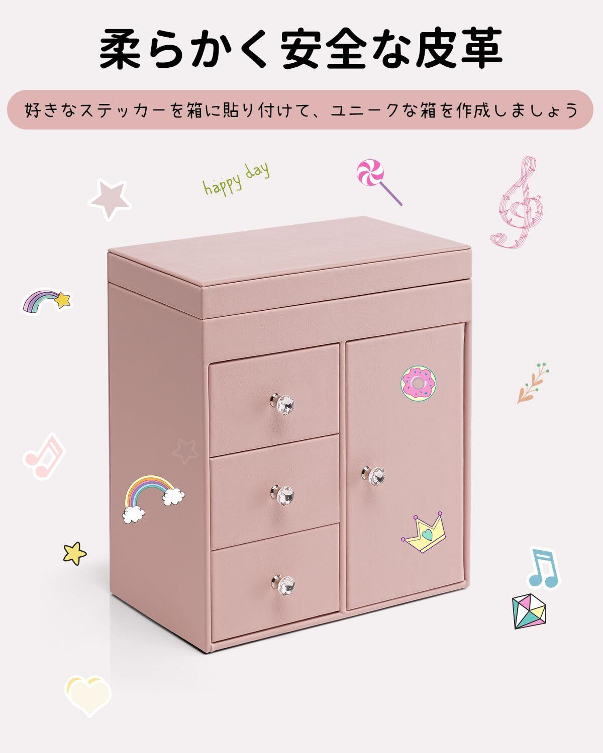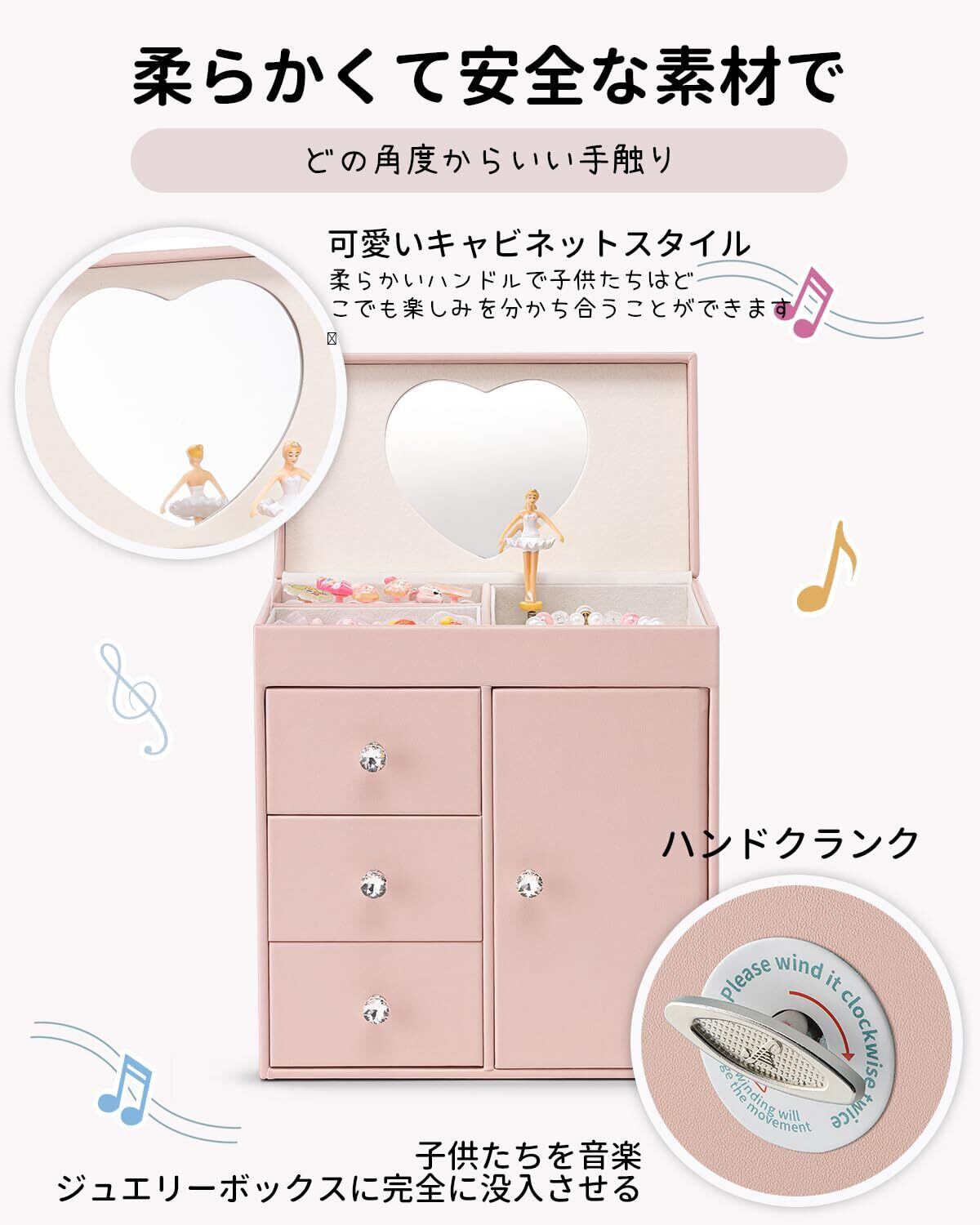 Vlando 娘へのプレゼント オルゴール ジュエリーボックス 大容量 鏡付き オルゴール プレゼント子供 アクセサリーケース 3段 引き出し バレエ発表会 プレゼント(ピンク)