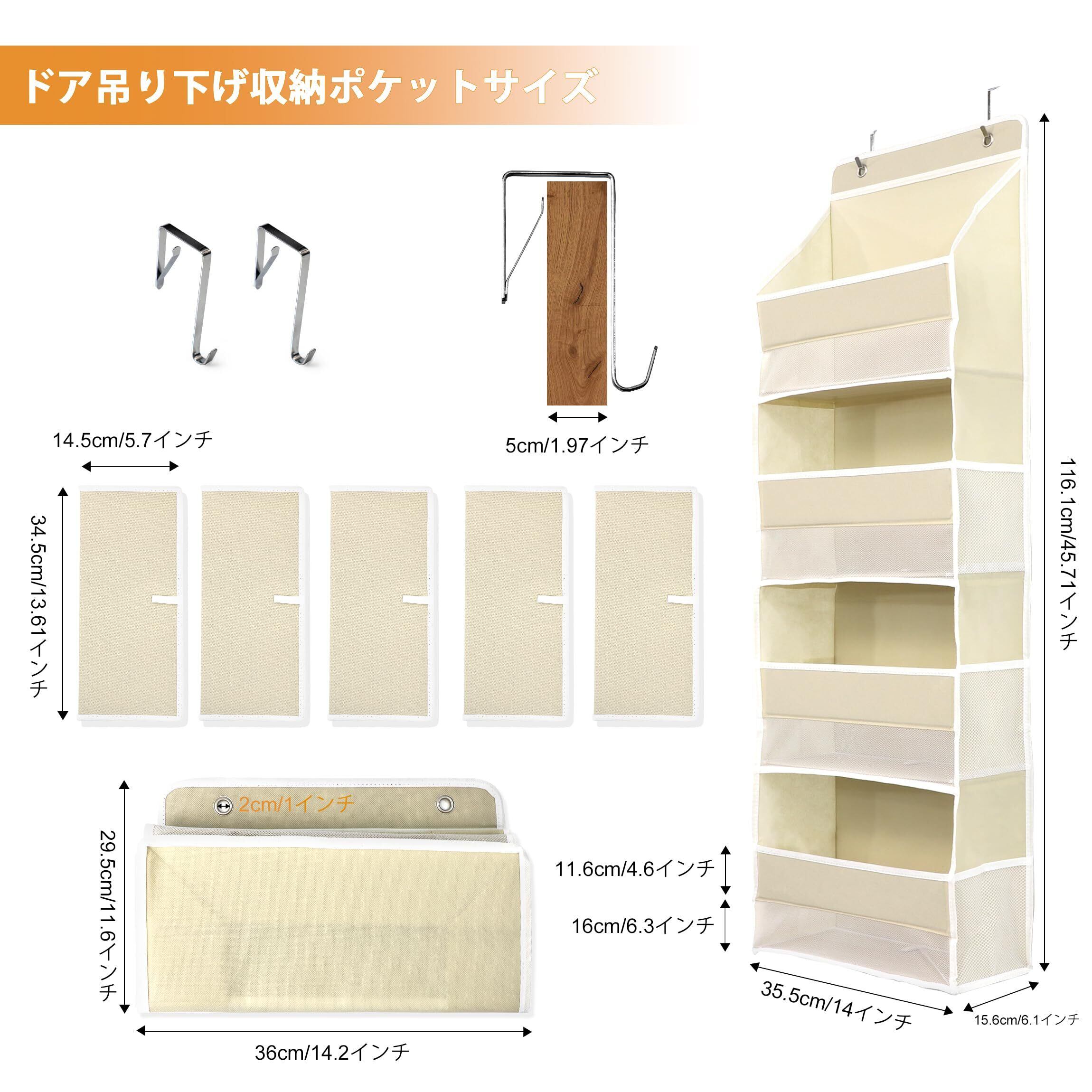 【ウォールポケット-サイズ】ポケットの深さ:12.7cm、ドア掛けポケットの長さ:36.3cm、ドア掛けポケットの幅:15.5cm、ドア掛けポケットの高さ:126cm このドア掛け収納は厚さ5cm以下のドアに対応しており、しっかりと固定できます。