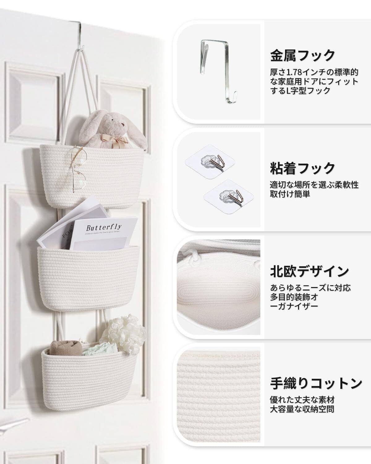 特徴 折りたたみ可能 ウォールポケット, 3段収納, 綿麻素材, 大容量, 隠す収納, 多用途, 省スペース, 壁掛け/ドア掛け対応
