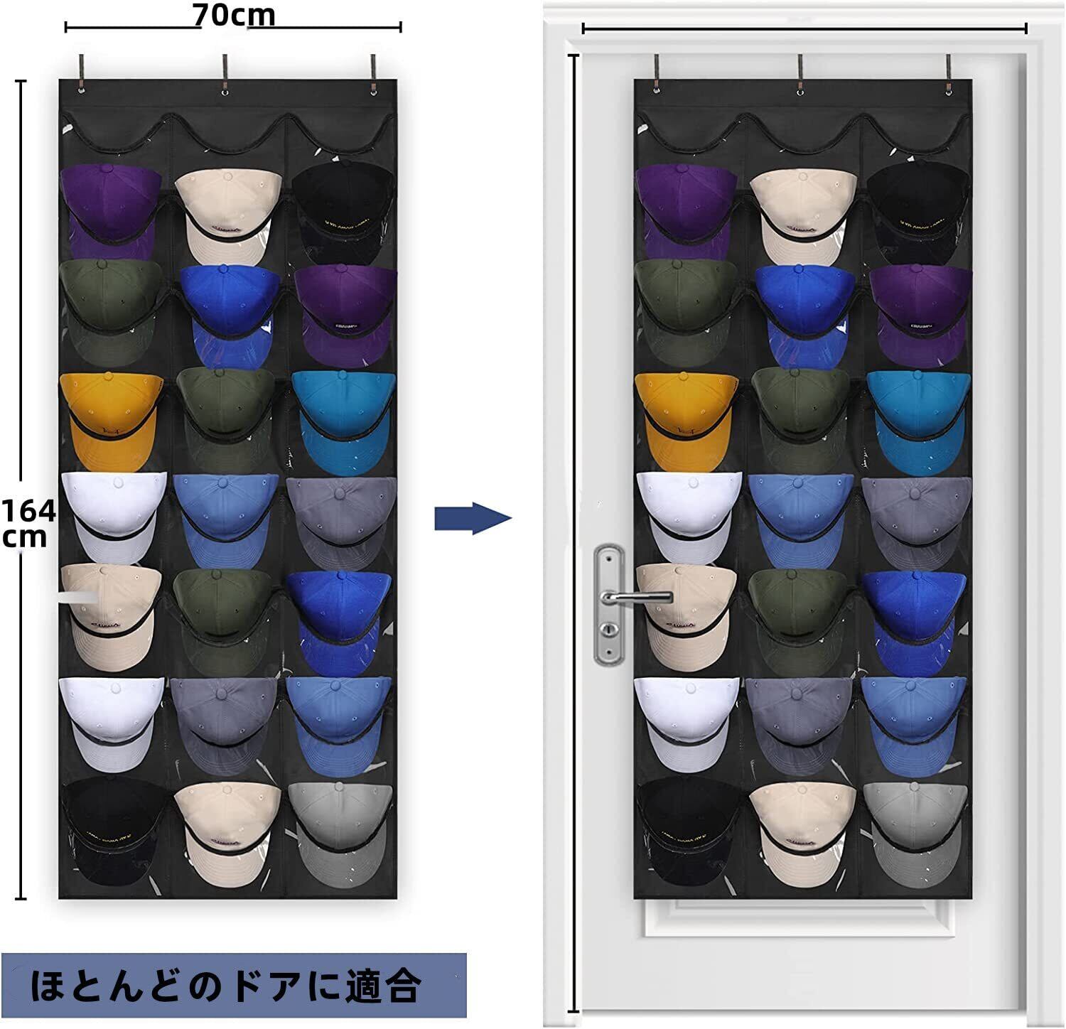 【上質な素材】:このウォールポケットは丈夫な生地を採用し、耐久性に優れています。色はブラックで、より汚れに強くなっています。フック3個付きで、しっかりと壁やドアに掛けられます。ある程度の重さを耐えられ、安心して数個の帽子を収納できます。