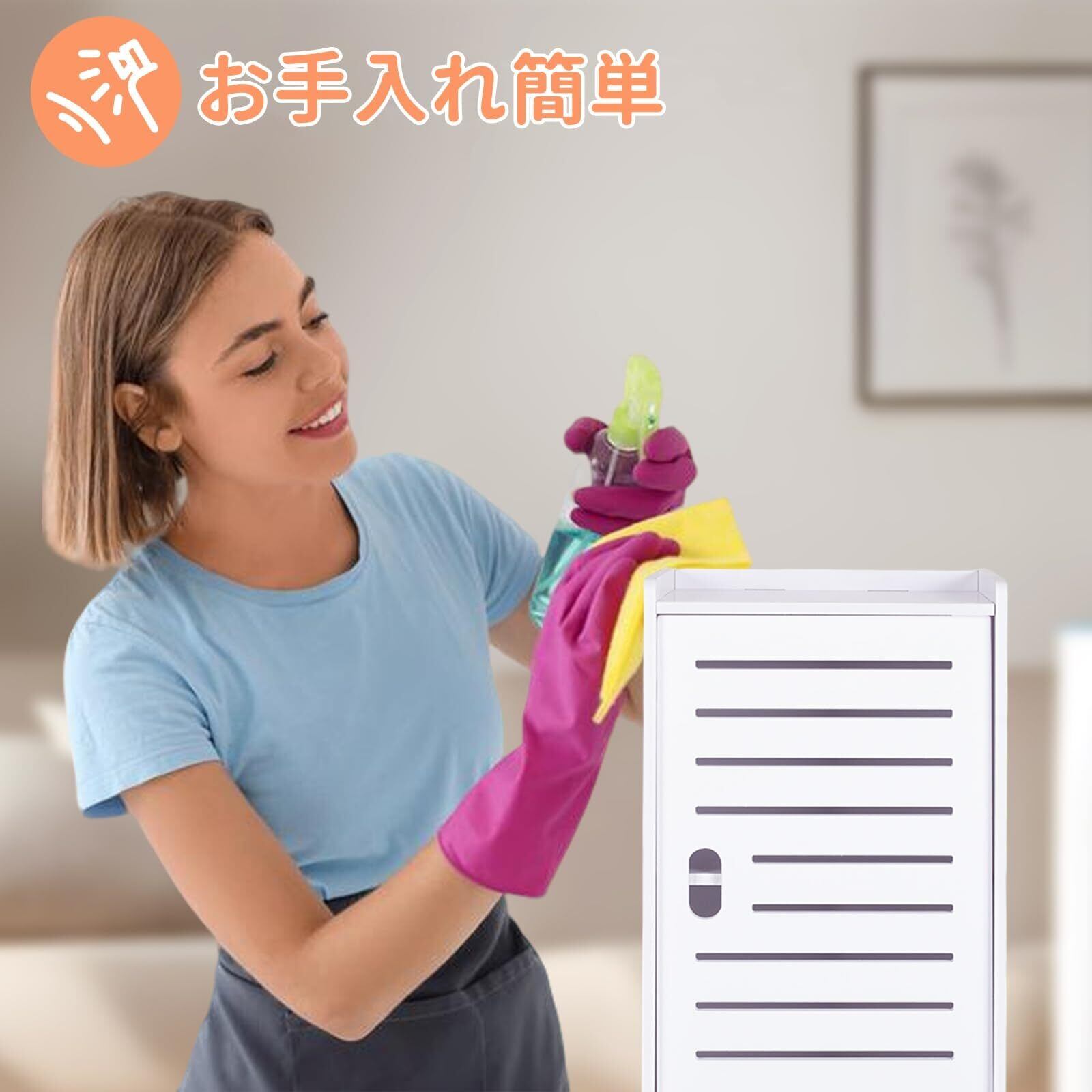 【優しい素材・機能で長く使用できる】優しいPVC素材を加工したものであり、木製より軽くで耐久性が強いだけでなく、トイレの湿気や水しぶきにも強く、カビができにくく、長期間清潔に使用できます。掃除アイテムからトイレットペーパーに生理用品、大きさや用途の異なるアイテムもスッキリ収納。クリーナーシートや生理用品は上段の棚へ、下段にはトイレットペーパーをたっぷり!