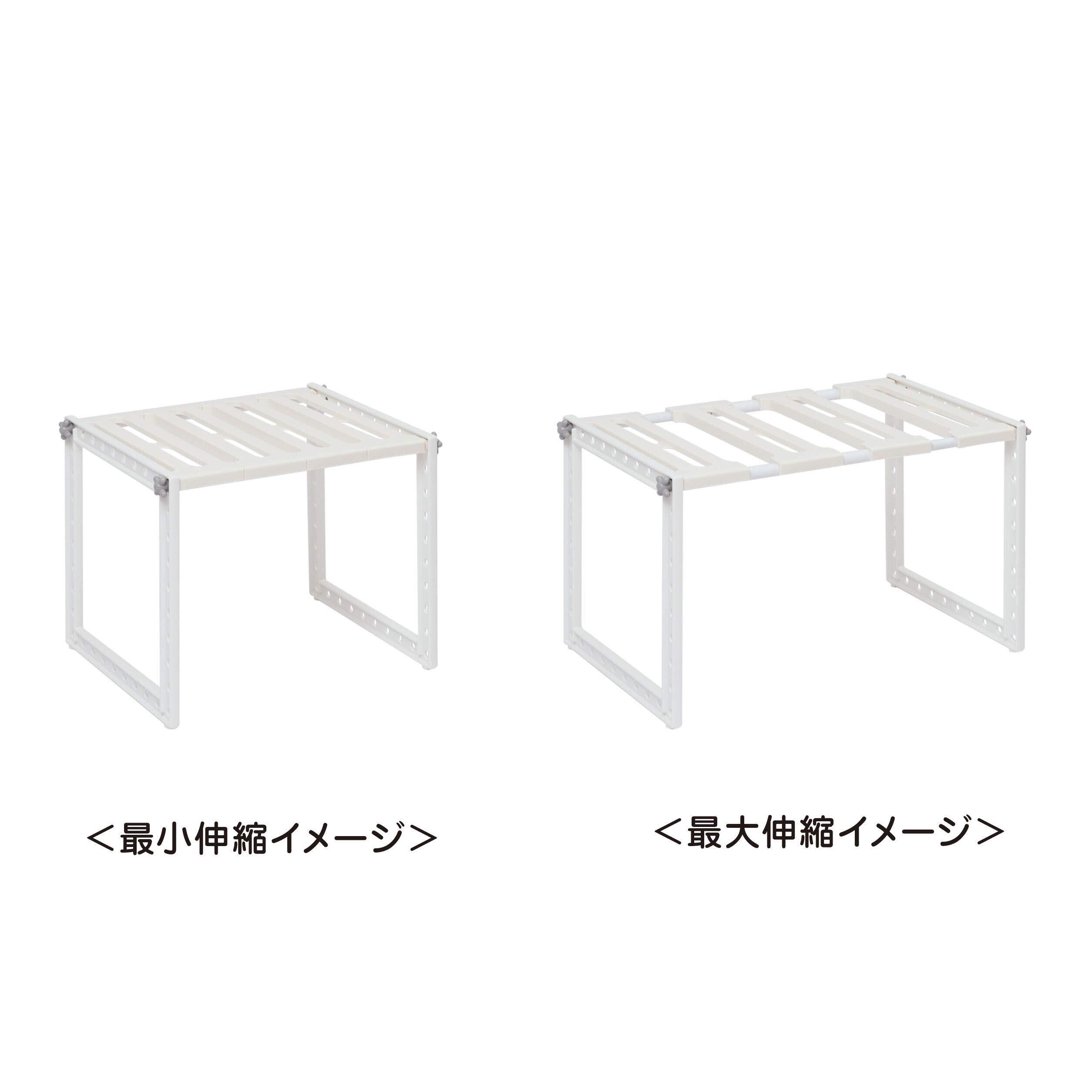 幅が伸縮式なのでサイズに合わせて設置。棚板は取り外し可能