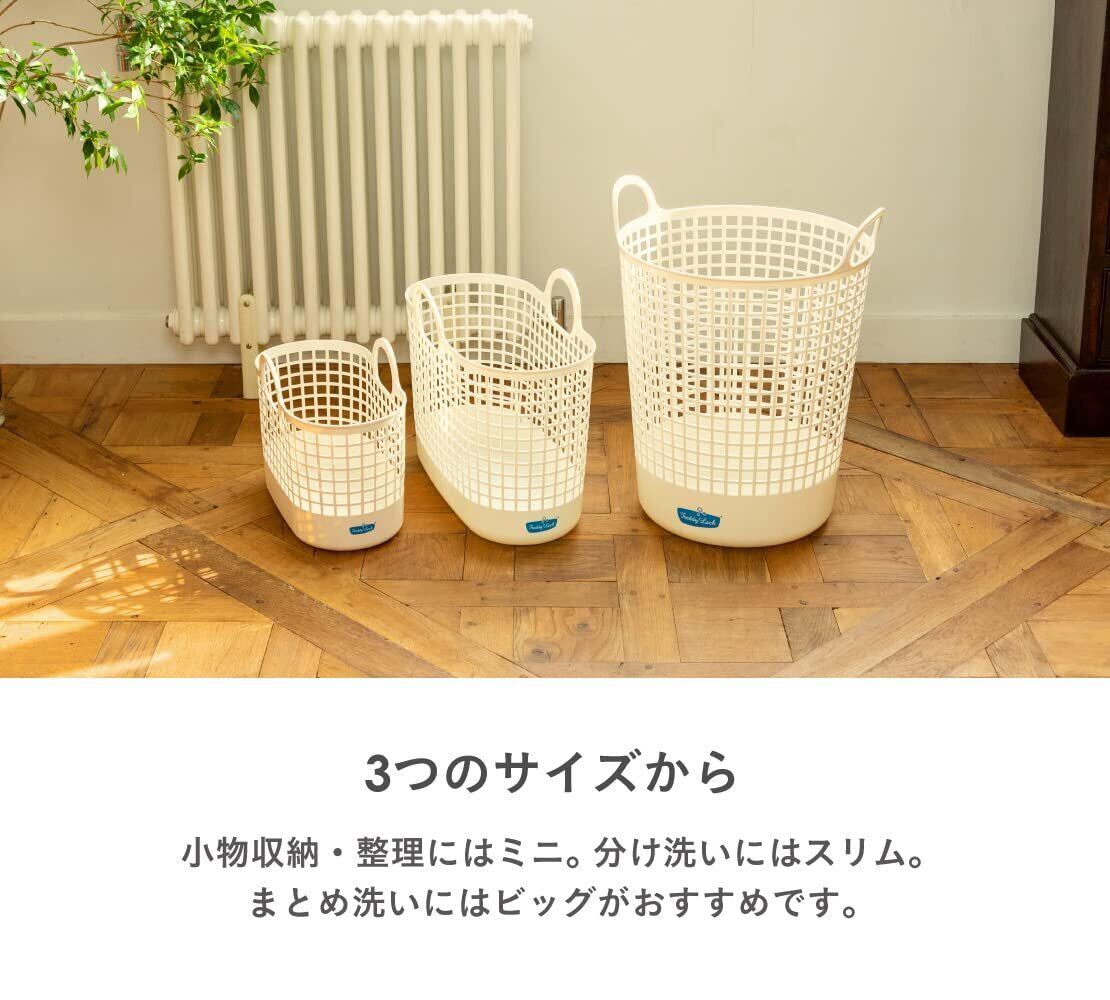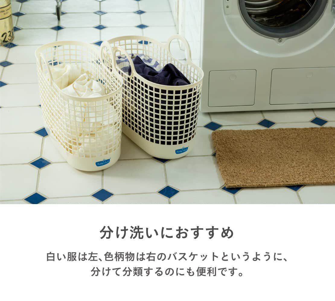【やわらかく持ち運びやすい】柔軟で軽量なポリエチレン素材で、持ち手を重ねれば、片手でも持て、階段の上り下りや干し場までラクに持ち運びができます。細やかな格子状バスケットで、通気性がよく湿気やニオイを溜め込みません。汚れをはじき、水洗いもできるので、いつも清潔に保てます。植物由来原料25%配合の環境負担を少なくしたバイオマスプラスチックを使用しています。