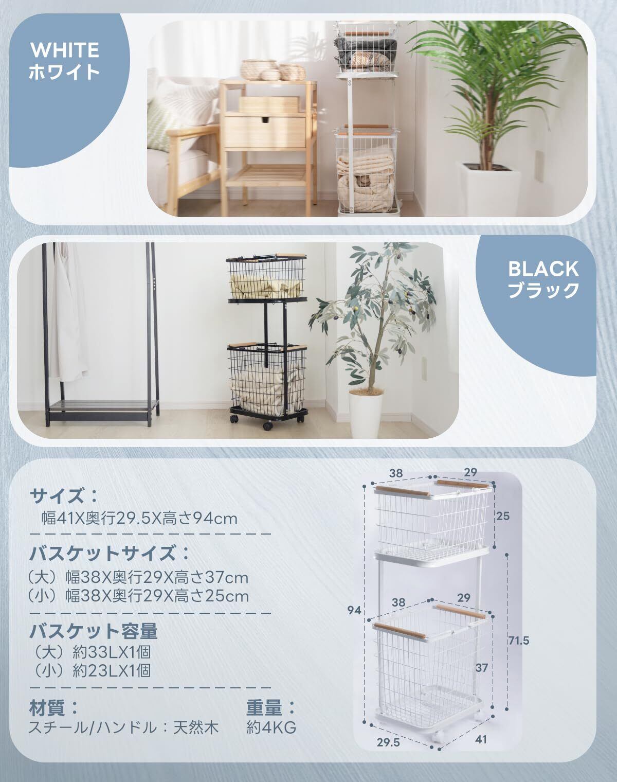 【商品仕様】本体サイズ:約W41×D29.5×H94cm / カラー:ホワイト / 製品素材:スチール(ワゴン、バスケット)、天然木(ハンドル)、ナイロン(キャスター)/ バスケット容量:大:約33L、小:約23L / 重量:約4kg