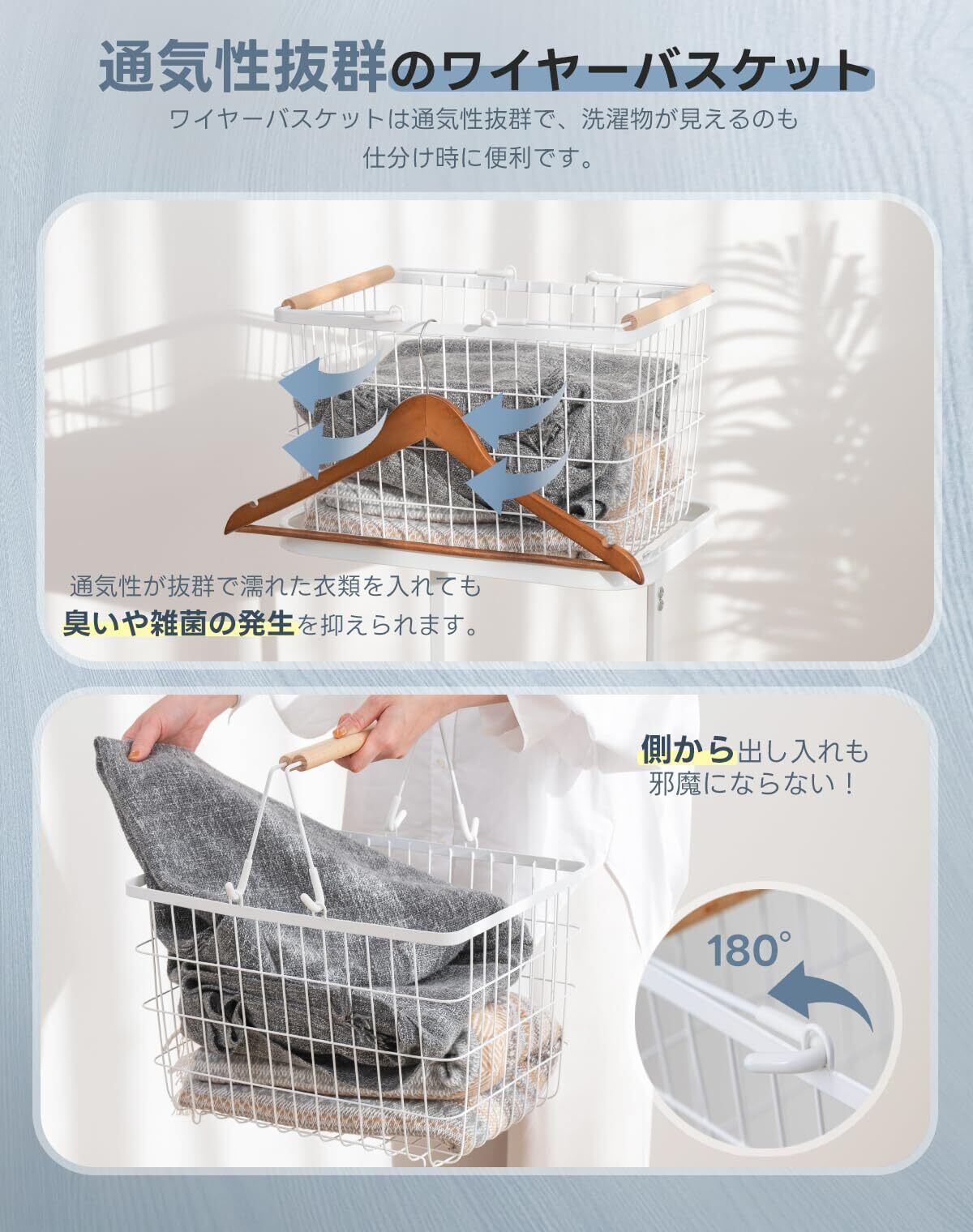 【高い通気性&清潔さをキープ】通気性に優れたバスケットで、湿気による臭いの発生を抑え、清潔を保ちやすい設計。さらに、スチールフレームには粉体塗装が施されているため、錆びにくく長く使い続けられます。