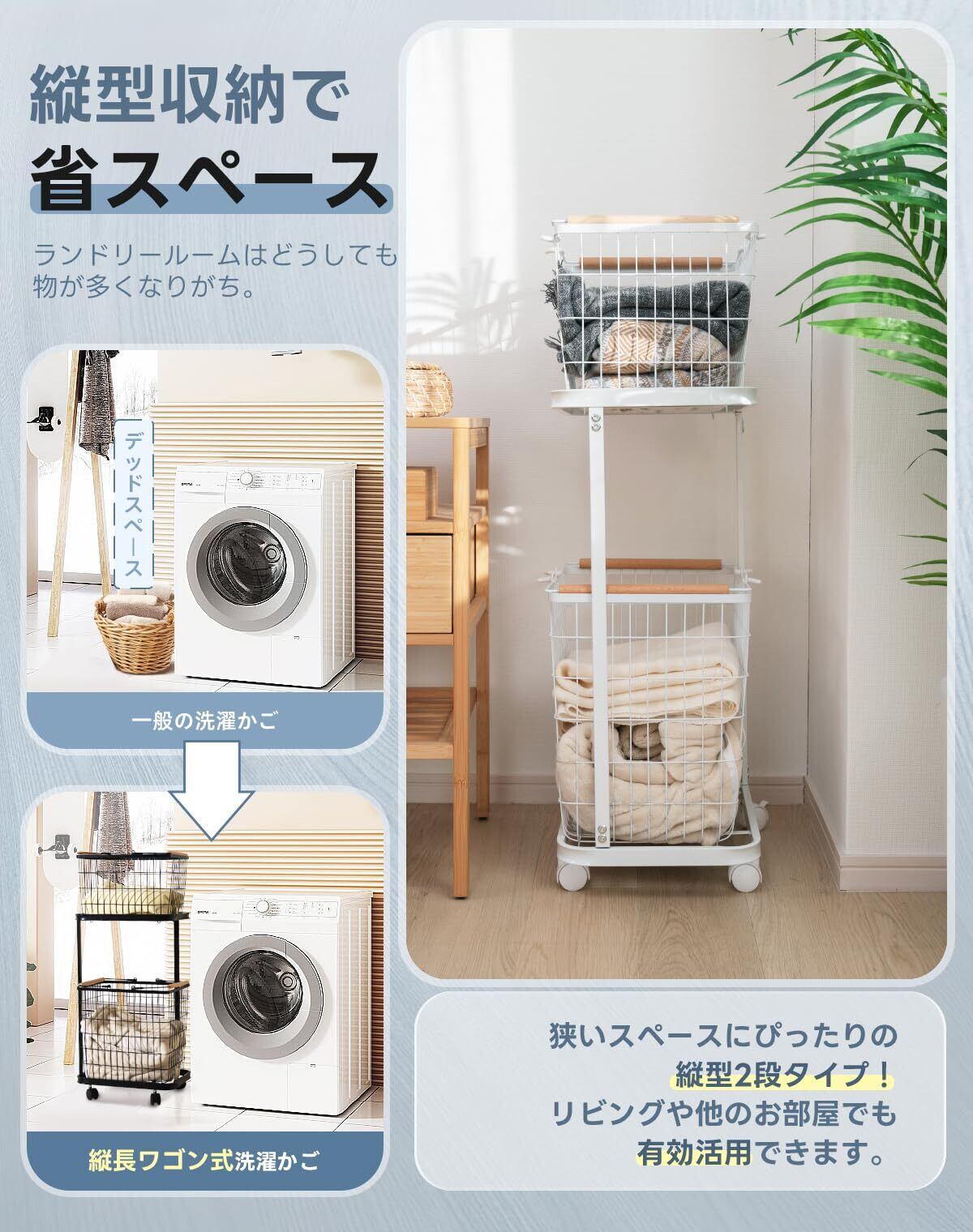 ✨【2段のラックを活用すれば、あふれる洗濯物もすっきり整理できます!】衣類やタオル、その他のアイテムもたっぷり収納できて、洗面所や脱衣所を広く使えます。