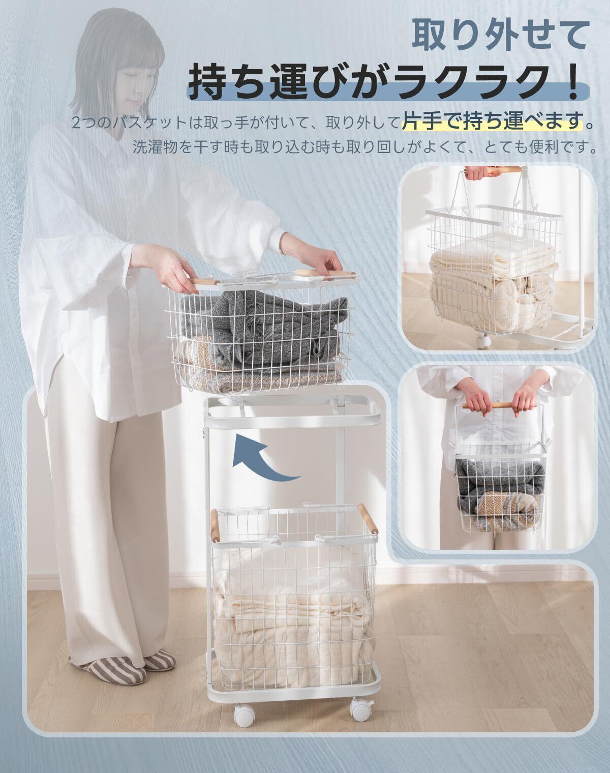 ✨【キャスターが付いていることで、簡単に移動でき、使いやすさも抜群!】洗濯機横や脱衣場など、必要な場所でサッと使えます。ストレスフリーな生活をサポートします。