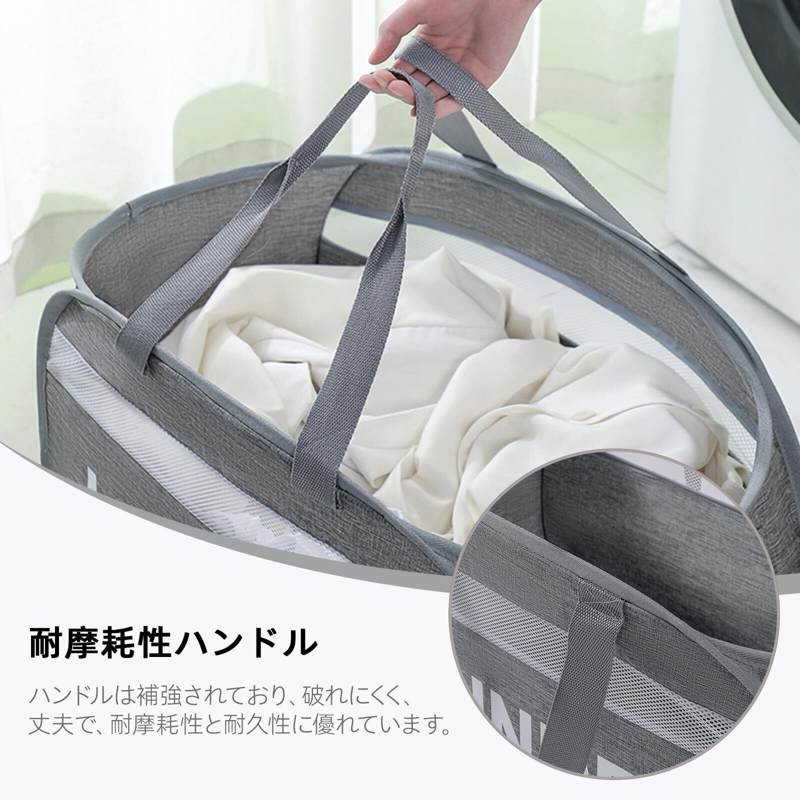 ダブルハンドルと横開口デザイン:この洗濯カゴは、大きな開口部を持つ独特のデザインで、汚れた衣類を簡単に取り出せます。長柄と短柄の2タイプのハンドルを採用、腕や肩にかけて持ち運べるため、家事事務を効率化します。