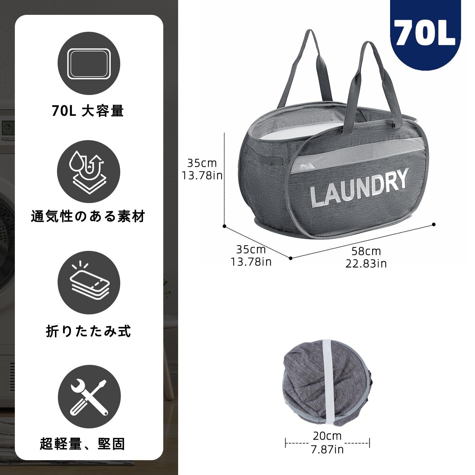 省スペースで大容量:この洗濯かごを折りたたむと、直径約 20 センチ、厚さ約 4.5 センチのコンパクトな円盤形になります。持ち運びに便利で、展開時のサイズは 58×35×35 センチ、容量は約 70 リットルです。壁の隙間や洗濯機の下、引き出し、洗面所の下、旅行用のバッグやスーツケースにも簡単に収納できます。