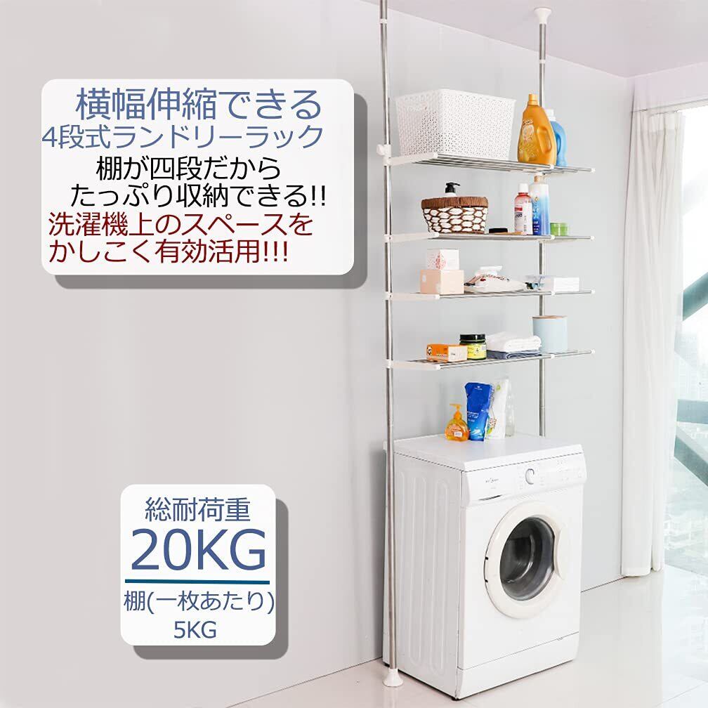 BAOYOUNI つっぱり棚 洗濯機ラック ランドリーラック4段 突っ張り式ラック 収納ラック 横幅伸縮式 ランドリー収納 ステンレス 段差があっても設置できる 耐荷重20kg 簡単設置 省スペース (ホワイト)