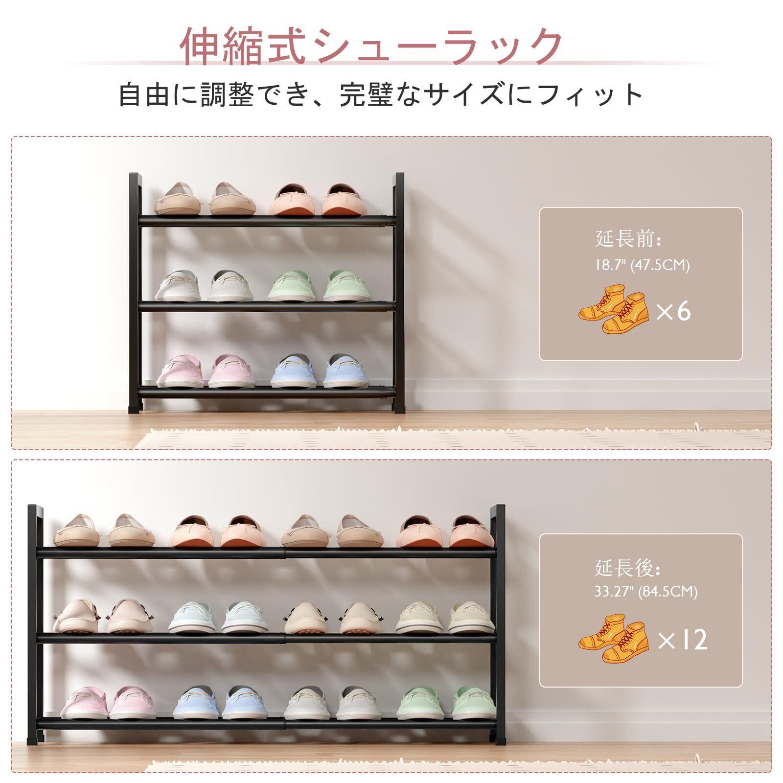 ✨【幅を調整できるため、あらゆるスペースにぴったりフィットし、玄関をスタイリッシュに演出します!】いつでも靴の出し入れがしやすく、使い勝手も抜群です。