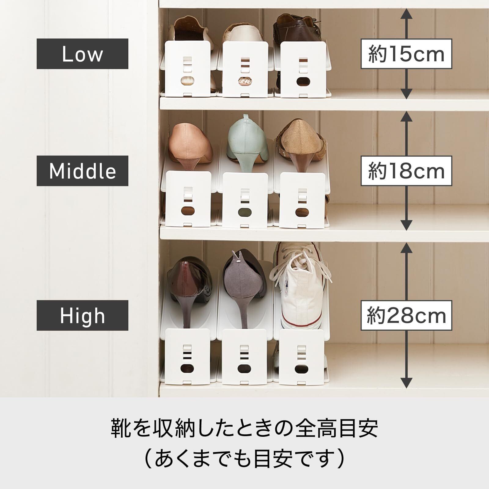 ✨【高さ調節機能付きで、10cmから18.5cmまで対応可能です!】スニーカーからヒールまで様々な靴にフィットし、収納の幅が広がります。