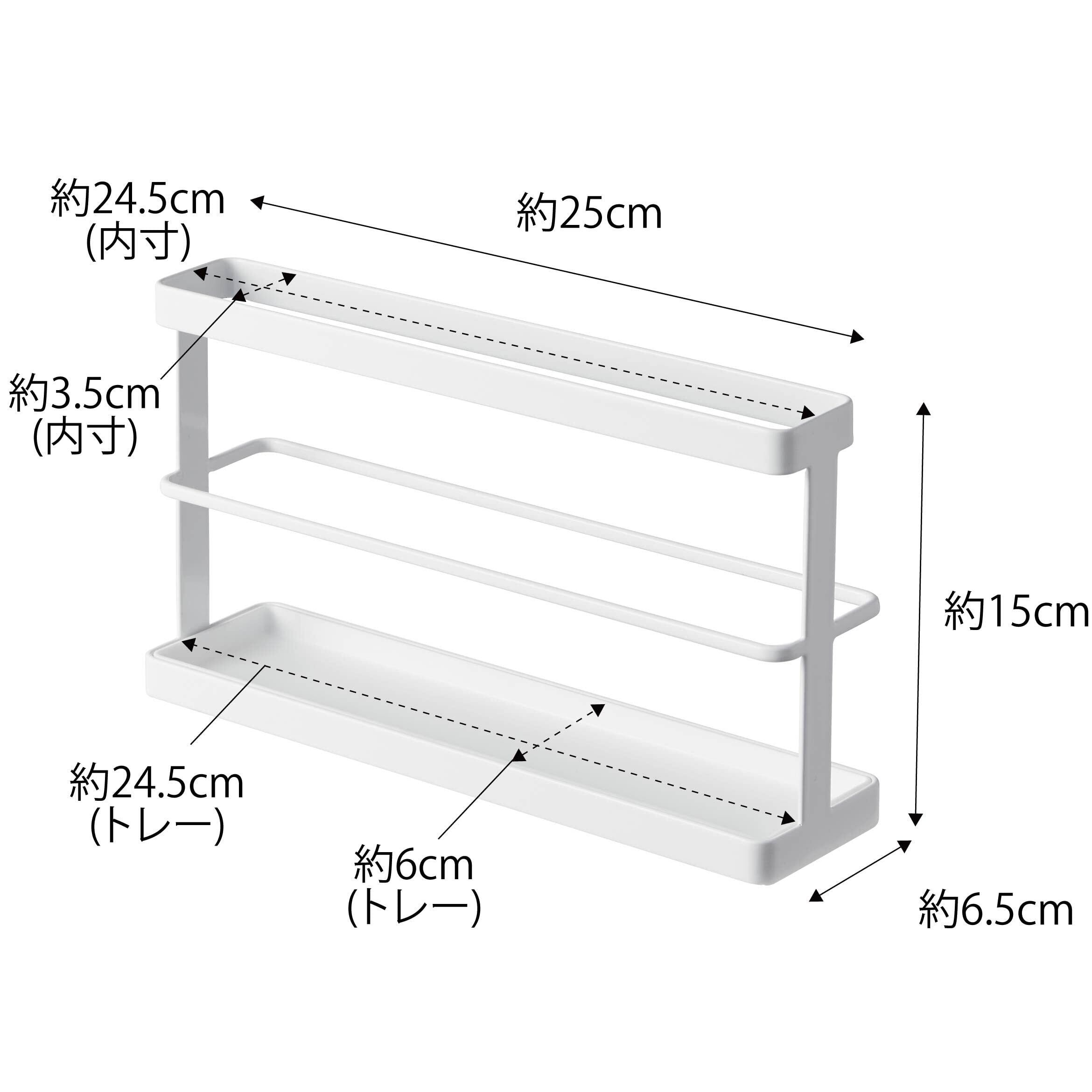 商品サイズ:本体:約W25×D6.5×H15cm(フィルムフック含まず) トレー:約W24.5×D6×H1.3cm フィルムフック接着面:約W7×H7cm(1つあたり) ・内寸:ホルダー部:約W24.5×D3.5cm