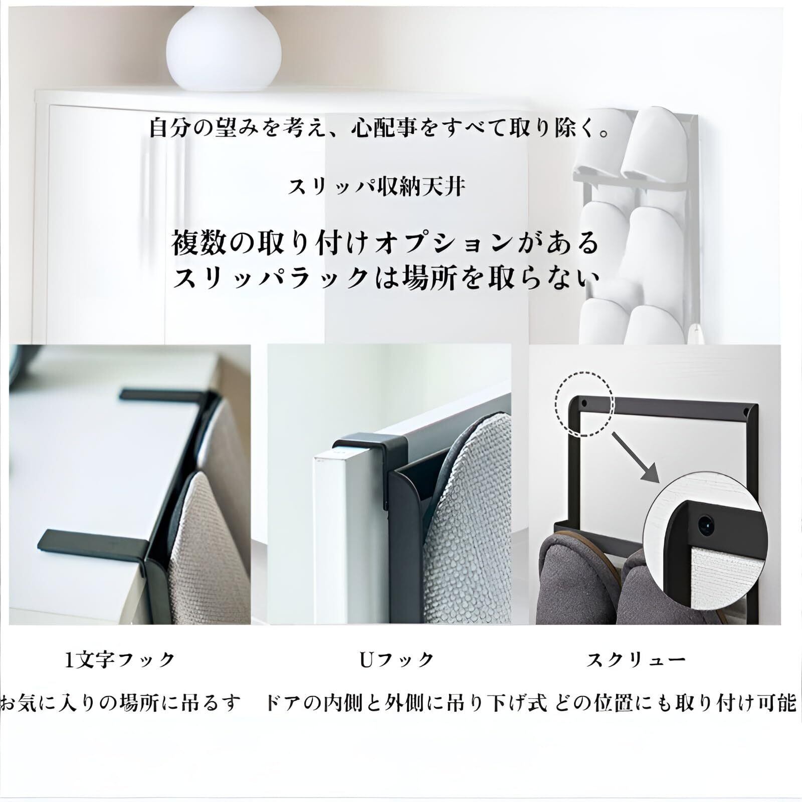 【壁掛けスリッパラック】U字型のフックデザインで、スリッパを簡単にラックに掛けられます。ネジ取り付けやテンション取り付けなど、複数の取り付けオプションを備えているため、さまざまな環境に適しており、保管スペースの柔軟性が向上します。