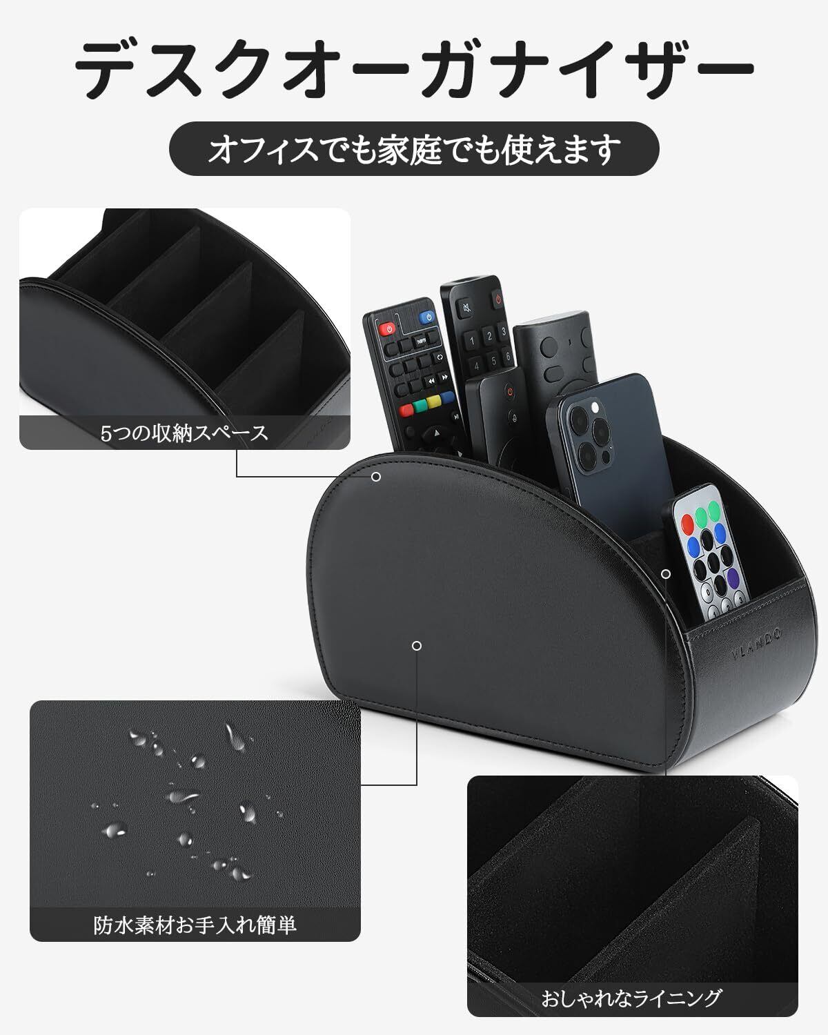 Vlandoリモコンラック PUレザー 大きいサイズ リモコン収納 テーブル 5格仕切り リモコンスタンド おしゃれ 防水 多機能収納ボックス 大容量 文房具 卓上小物 ブラック
