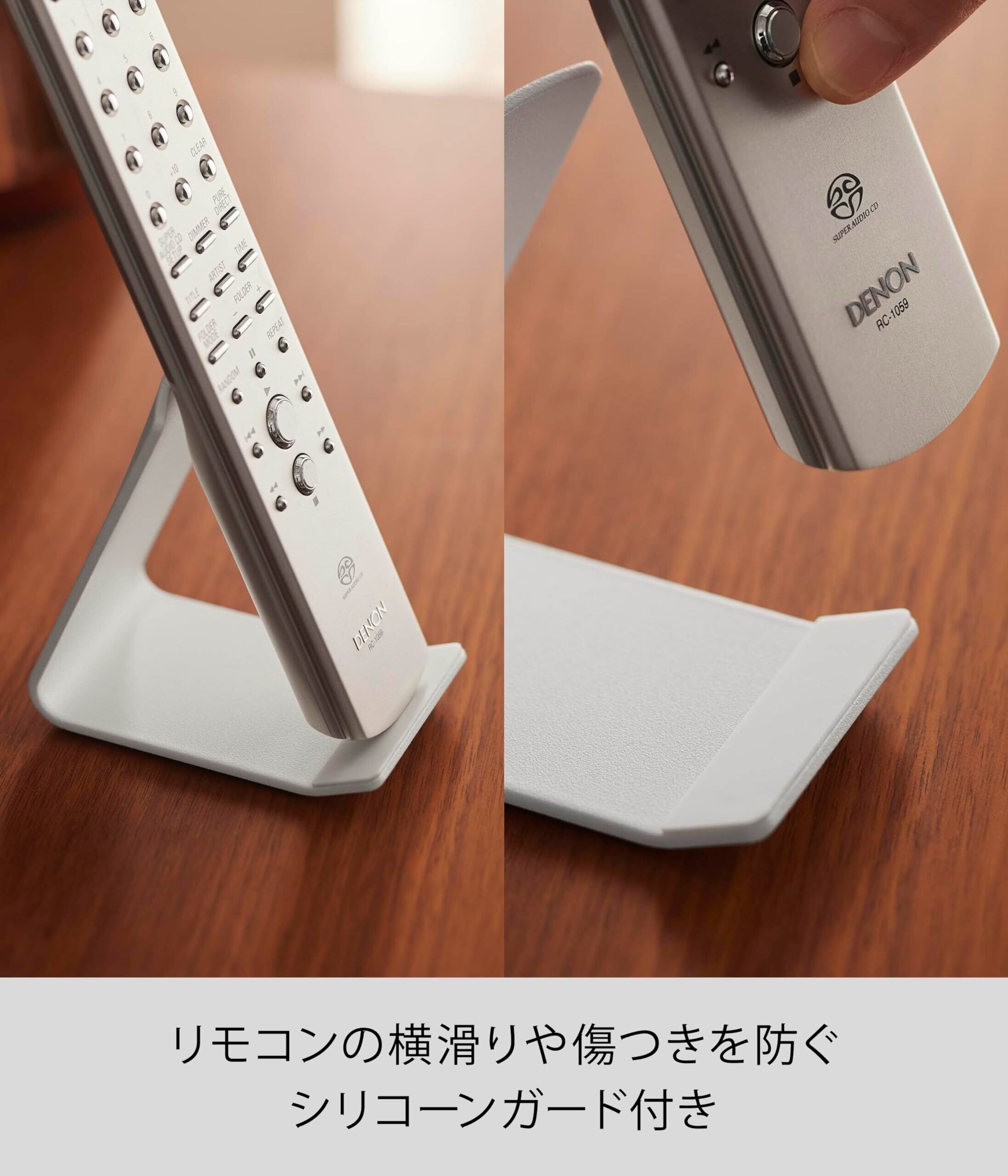 ディスプレイ収納ができるリモコンスタンドです。リモコンの背面がフィットする構造で、様々なサイズに対応。キズつきにくいシリコーンガード付き。