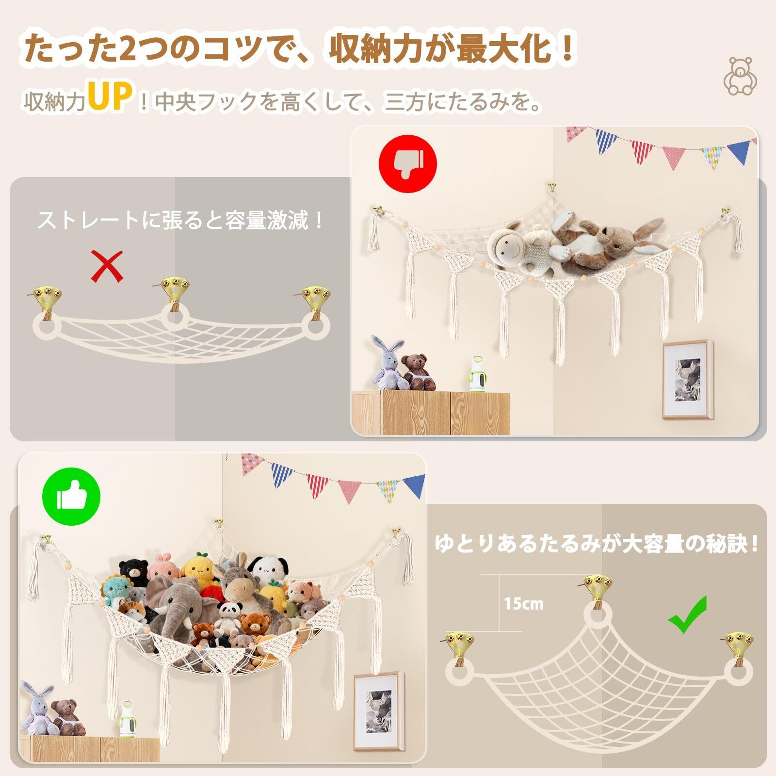 【正しい取り付けで収納力最大化】大容量の秘訣は“たるみ”にあります。中央のフックを両端より15cm高く設置するだけで、美しい弧が自然にでき、ものが落ちにくく収納力がアップ!