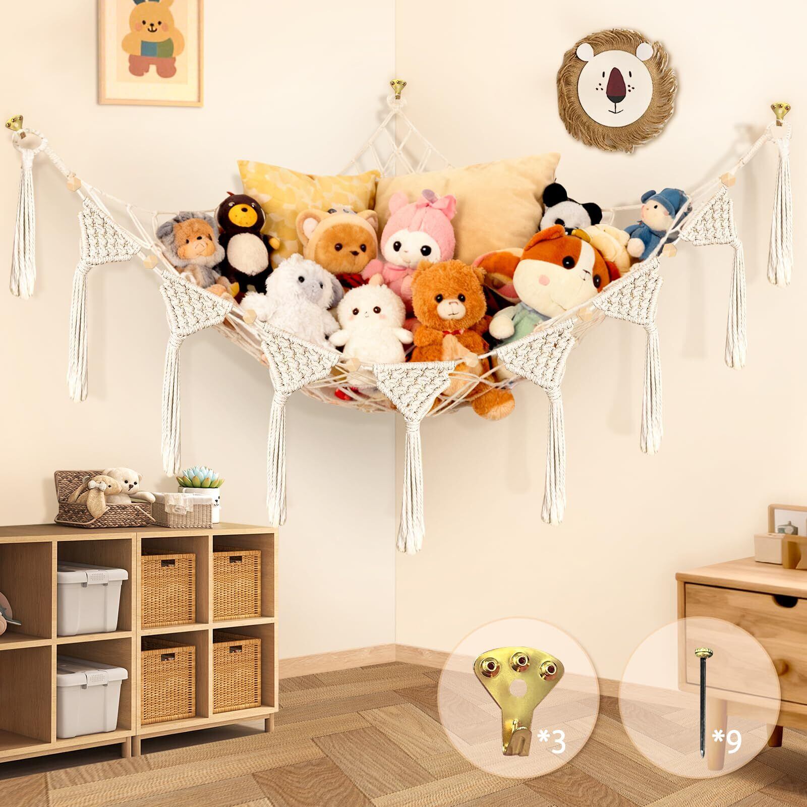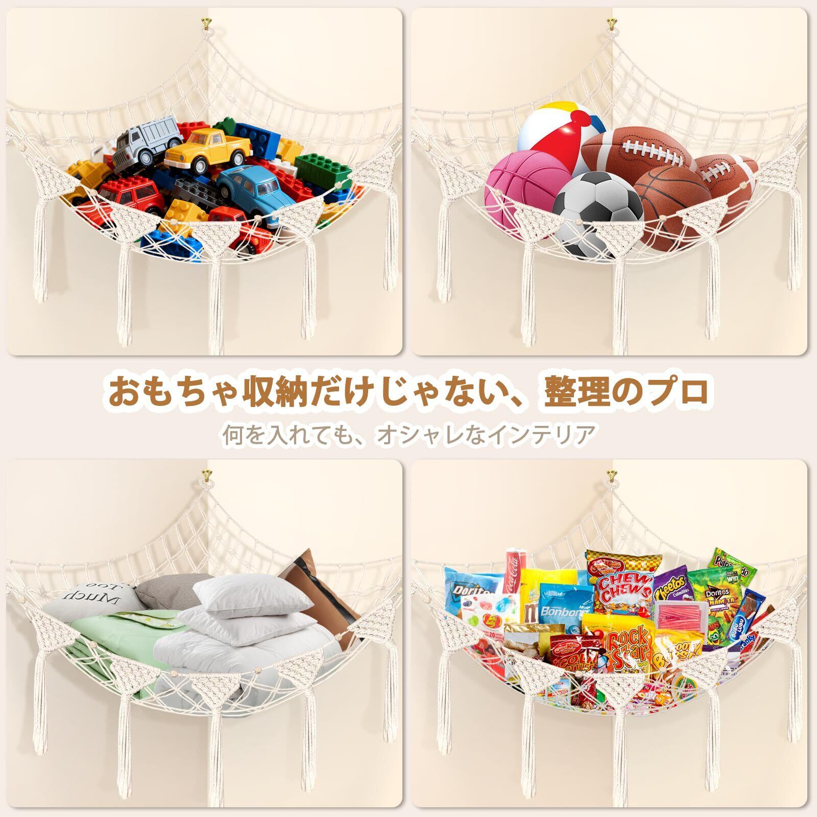 1)手編み風の綿100%ハンモック収納ネットです。 2)頑丈な金属リングと目の細かいメッシュで、小さなおもちゃの落下を防止。 3)壁角3点で簡単に取り付け可能で、床を占有しないため、子供部屋やリビング、バスルームの整理整頓に最適。 4)散らかりを解消し、すっきりとした快適な空間を創り出します。