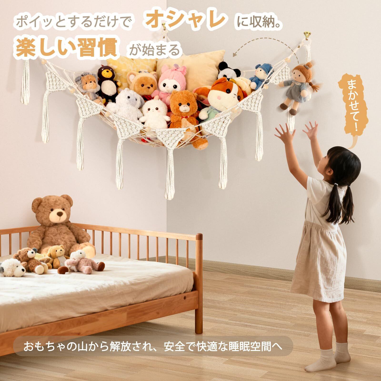 ✨【この手編みのハンモックは、温かみのあるオフホワイトのデザインが特徴です!】おもちゃやタオルをおしゃれに整理し、お部屋をすっきりと保つことができます。