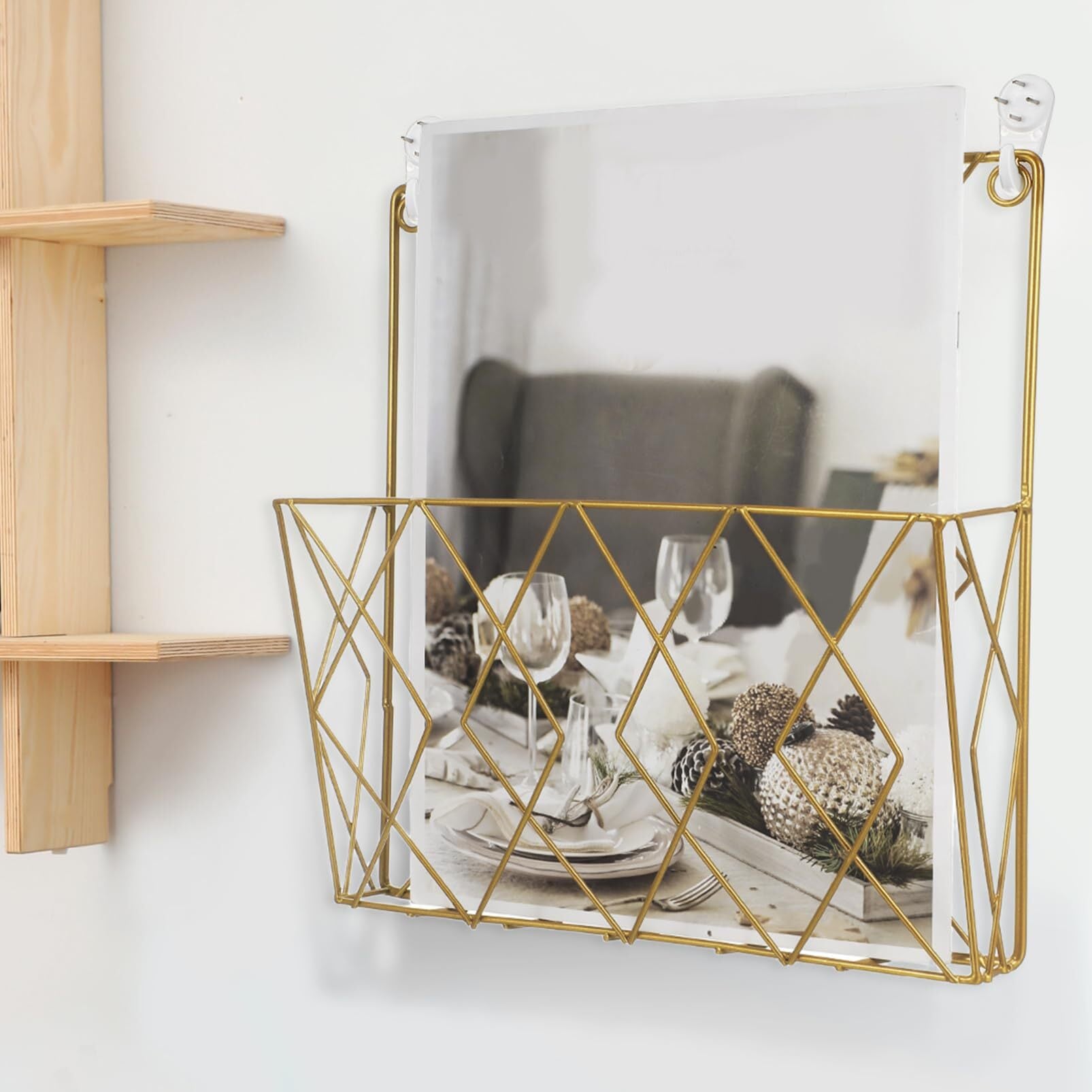 ✨【この壁掛けマガジンラックは、あなたのスペースを美しく彩りながら、効率的に収納を実現します!】エレガントなゴールド仕上げは、どんなインテリアにも溶け込む洗練されたデザインです。